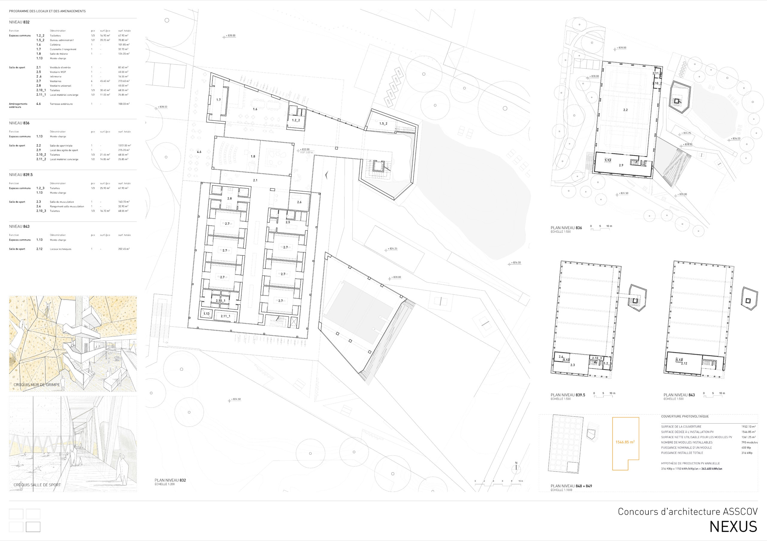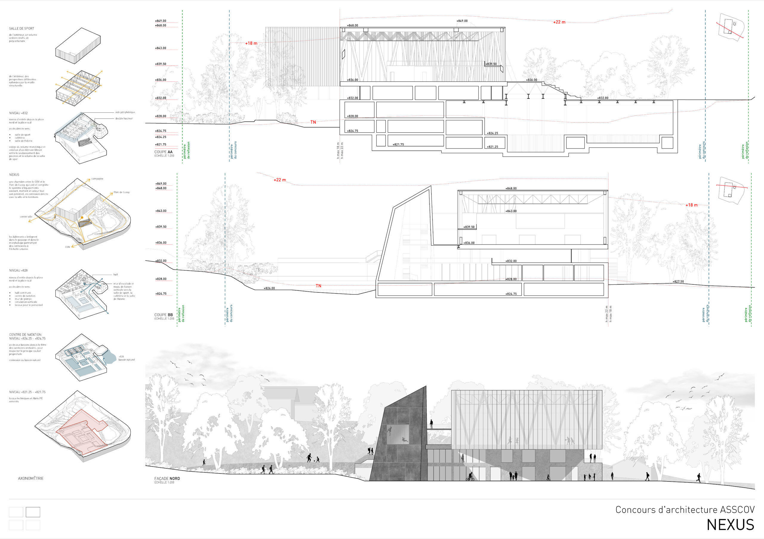 Le immagini 3d, sia realistiche, sia schizzate mostrano con forte immediatezza, come queste caratteristiche, sia negli esterni sia negli interni, creino prospettive interessanti tra uno spazio e l’altro che trovano sia una corretta indipendenza funzionale senza rinuciare alla possibilità di fare una attività sportiva avendo la visuale di un’altra: dallo spazio pubblico esterno si puòtraguardare la piscina ipogea, dal ballatoio/spalti della palestra, le sottostanti aree ginniche, il volume arrampicata e l’esterno, la zona hall ha una vista privilegiata sulla parte di arrampicata che la ingloba anche. Le prospettive divengono, così, sempre momenti privilegiati, interessanti e mai scontati per designare il collegamento che nexus a partire dalla ciità riproietta negli spazi interni.