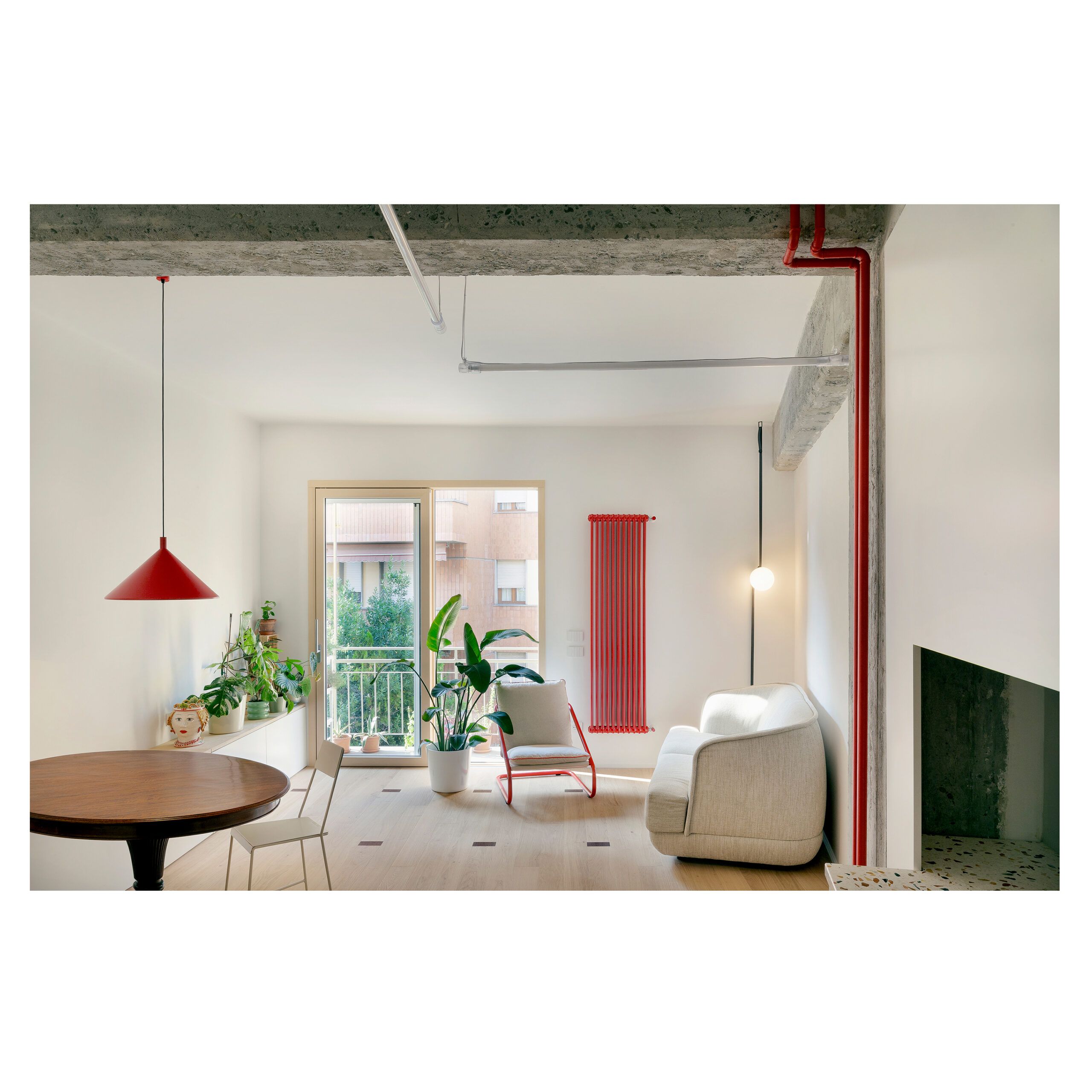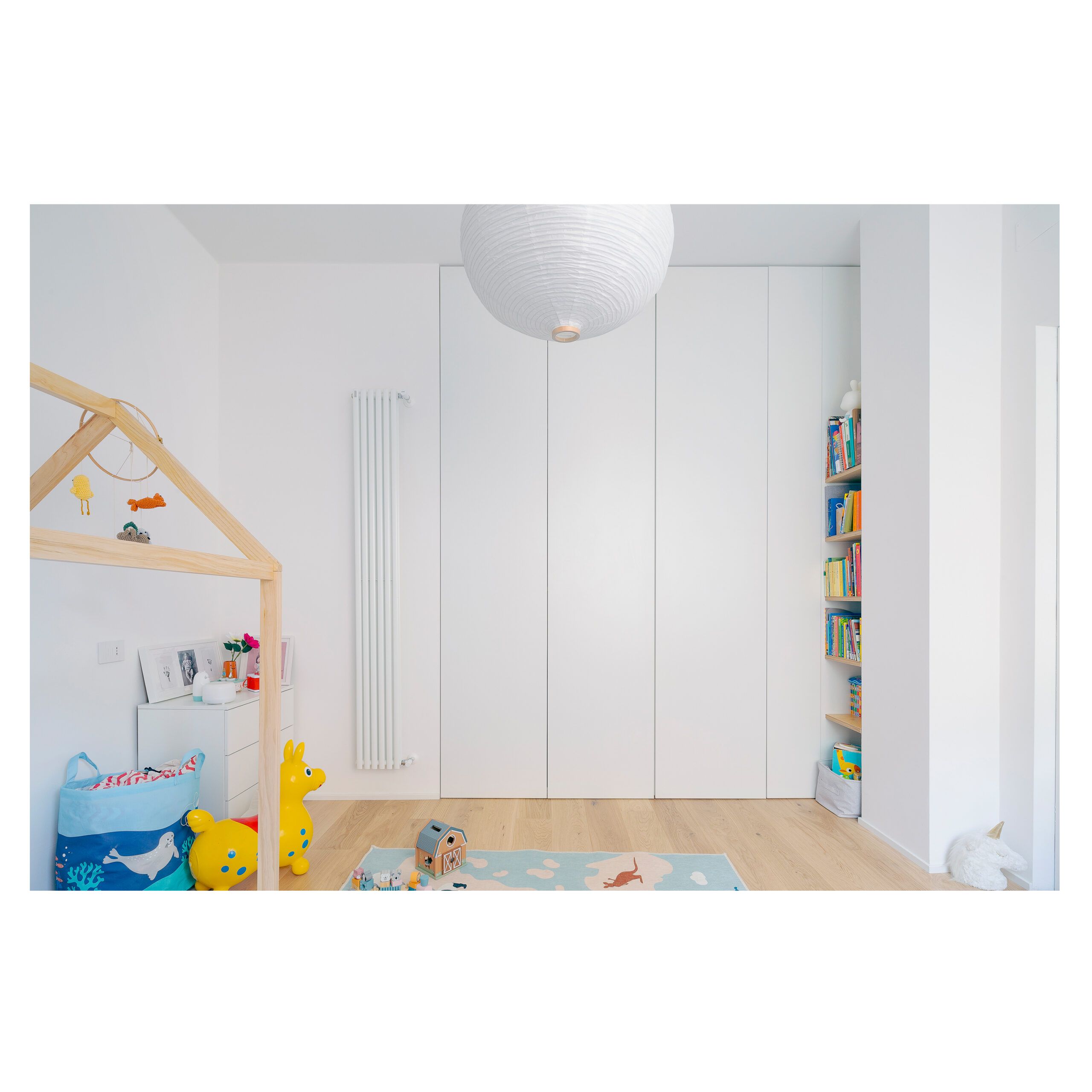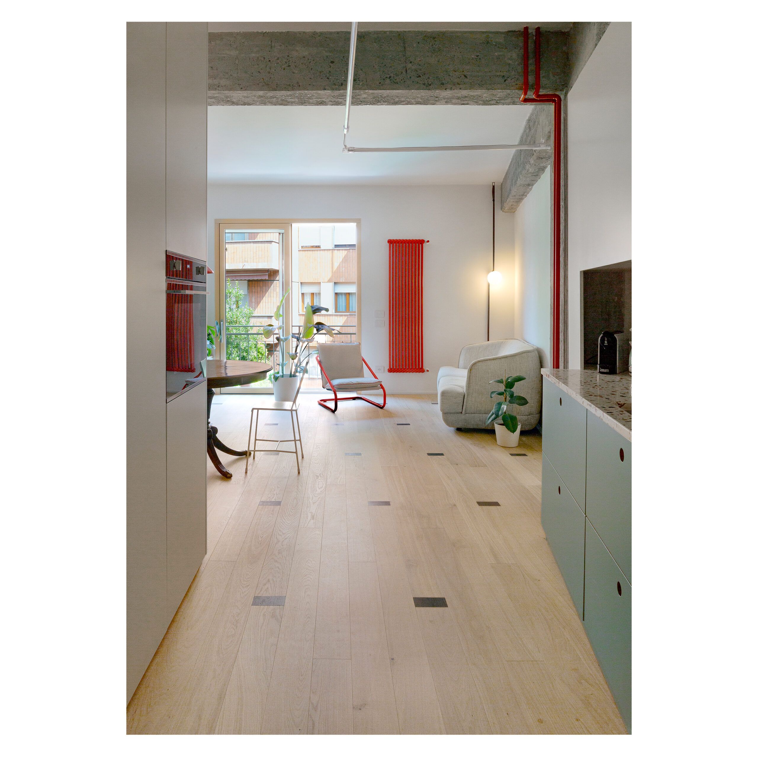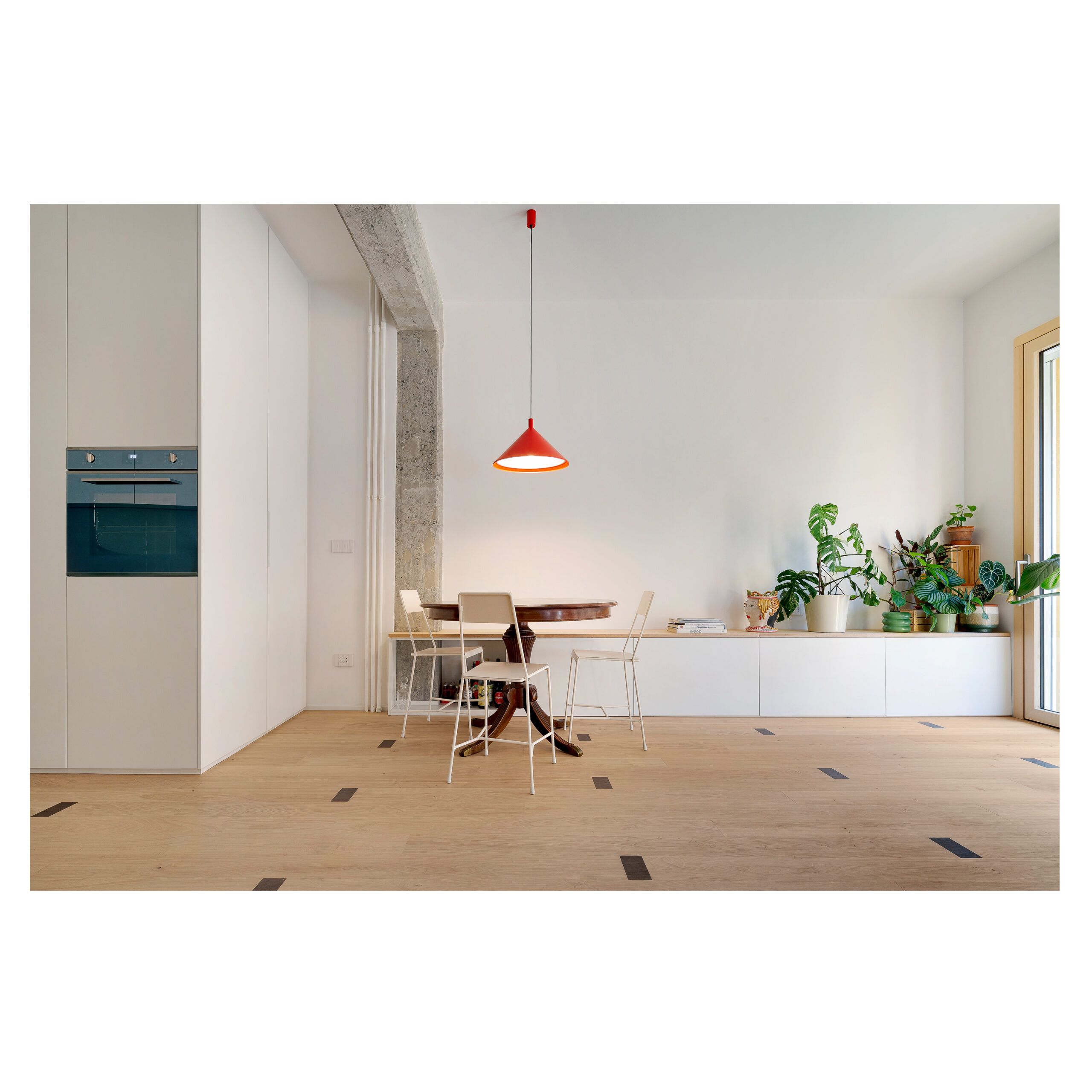 Questa direzione di progetto è stata intrapresa in primis attraverso il parquet, presente nell’open space e nelle 2 camere. Da questa scelta materica per gli ambienti, che possiamo definire usuale, siamo partiti con declinazioni uniche. Il parquet in questo progetto non diviene elemento unificatore ma opportunità di caratterizzazione dei singoli spazi e così nella zona giorno abbiamo optato per un rovere chiaro posato a correre, dove intarsi in legno scuro movimentano e geometrizzano con dolcezza l’ambiente creando dei punti fermi visivi dove tutto è disallineamento e sorpresa. Se il primo tema è eredità degli spazi ed ineludibile elemento, il secondo nasce dalla volontà di portare elementi giocosi ed inusuali così come l’uso del colore rosso per tutte le componenti di “calore”: il termosifone in soggiorno, la luce conica sul tavolo, la testa del rubinetto del lavabo cucina e le montanti del riscaldamento che abbiamo lasciato esterne.