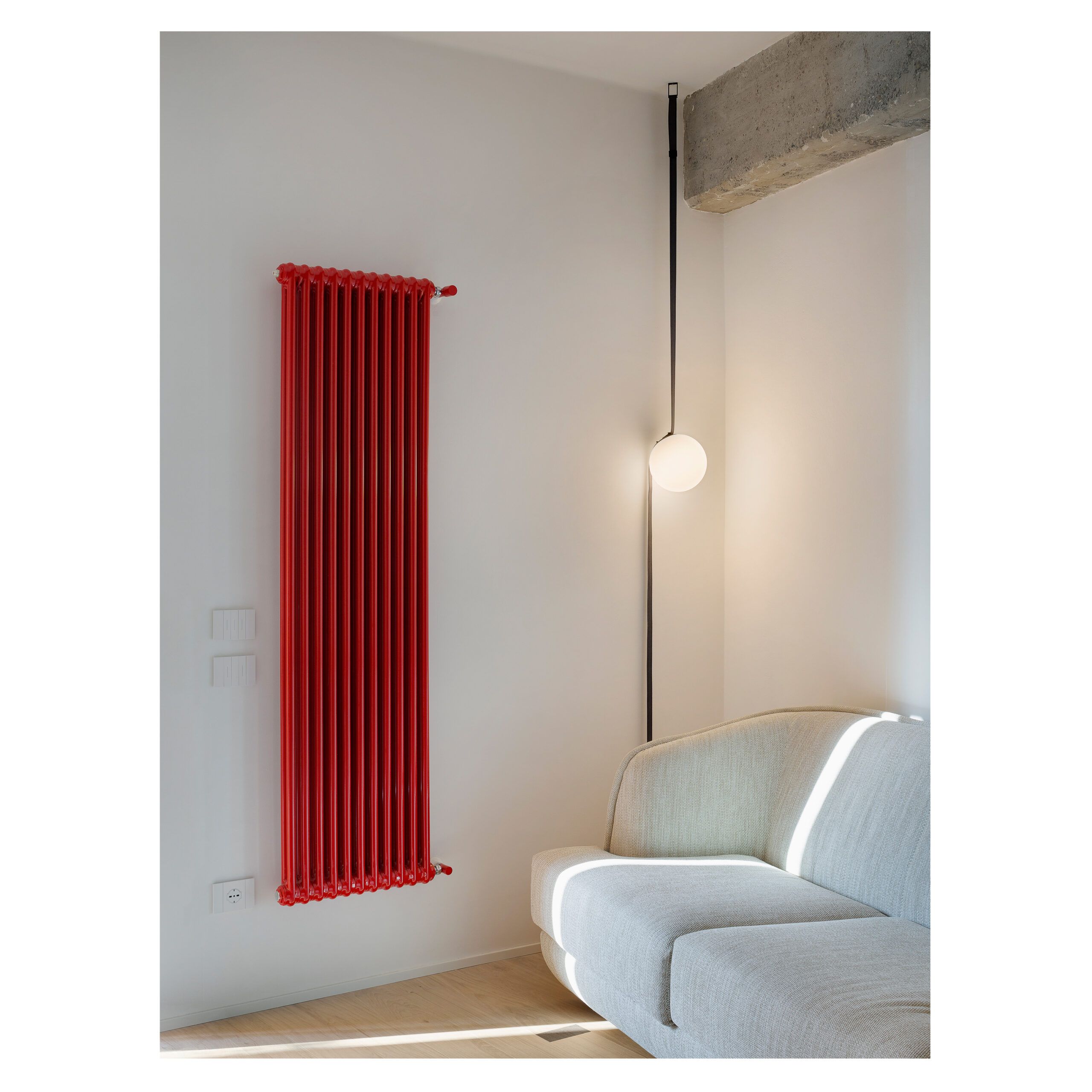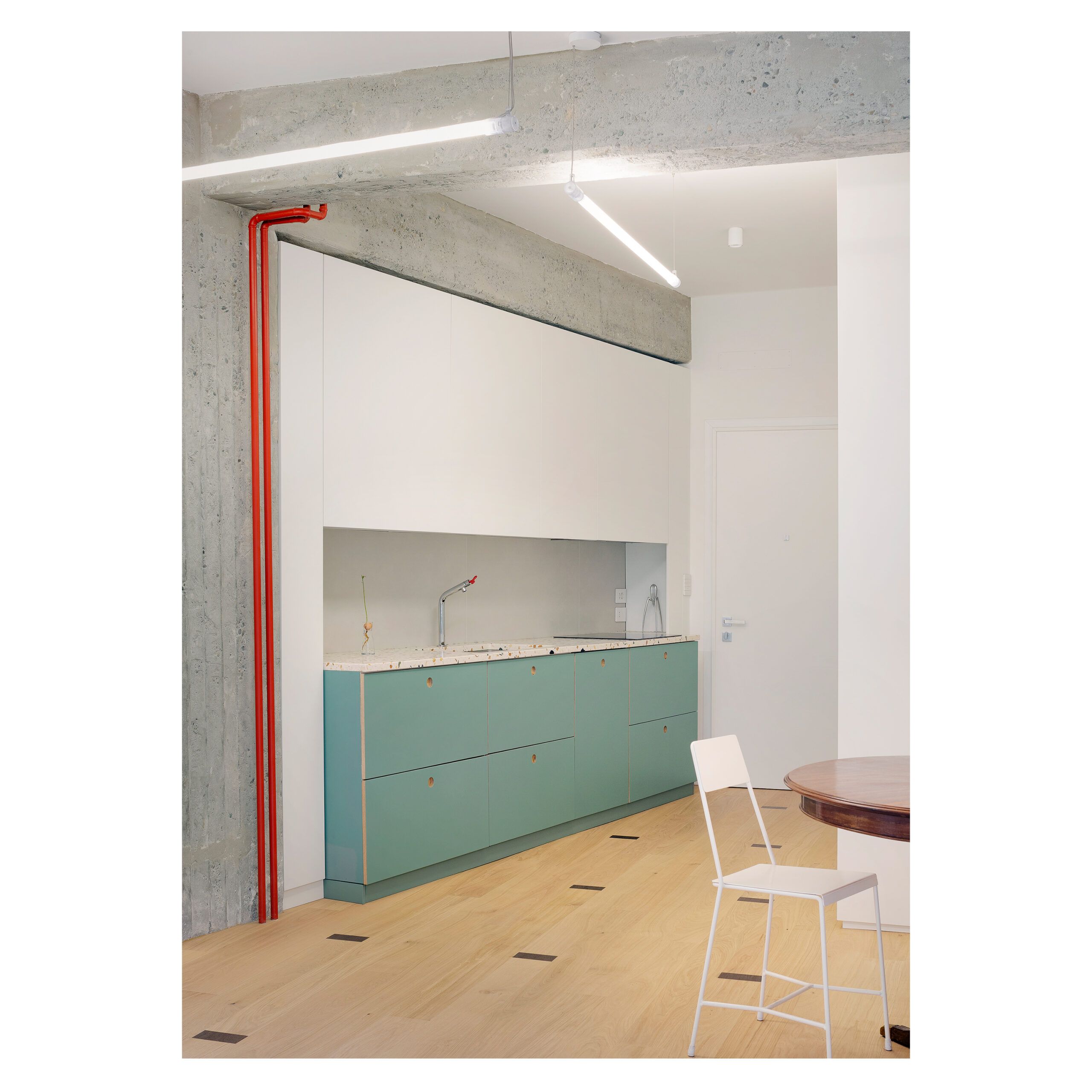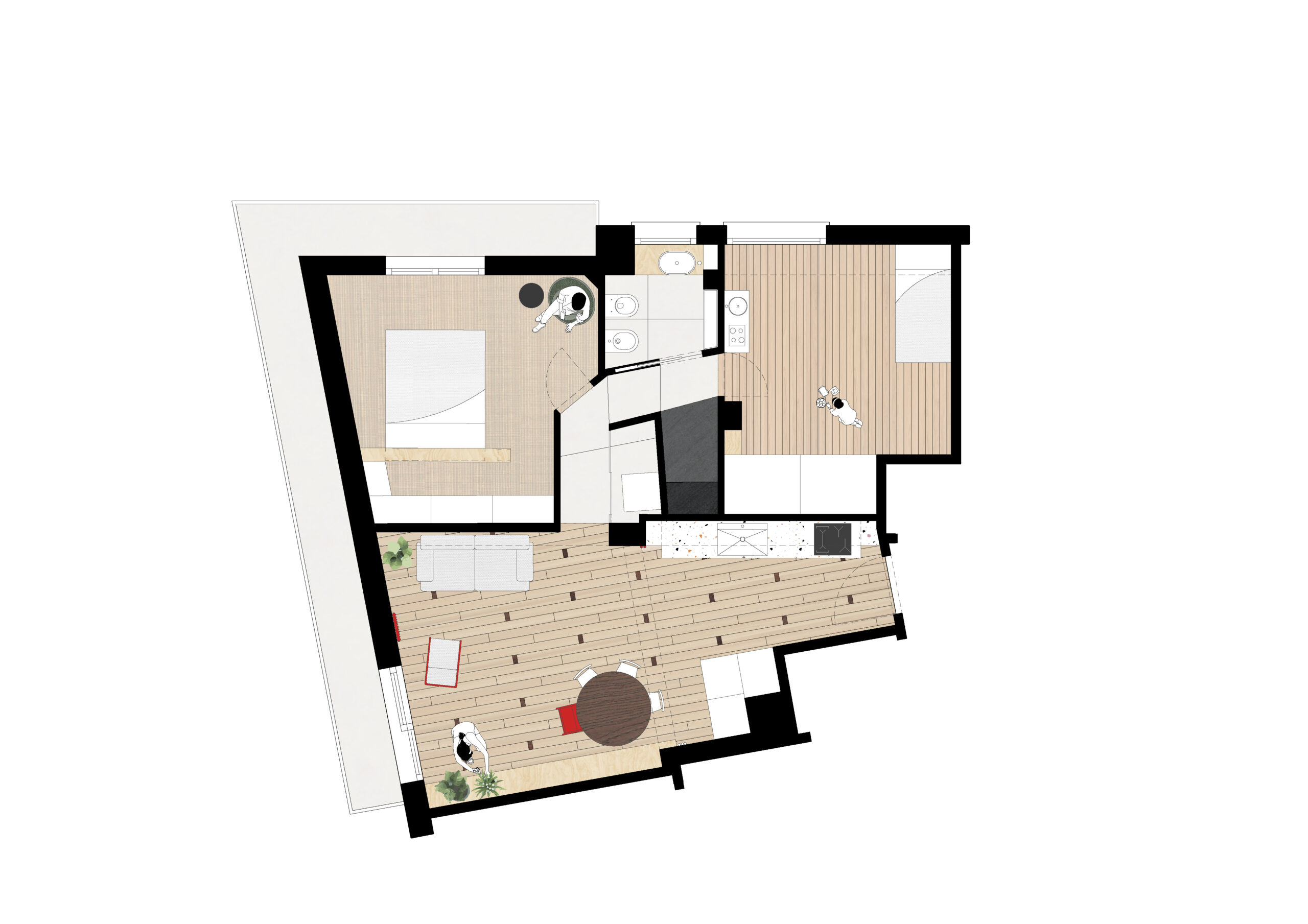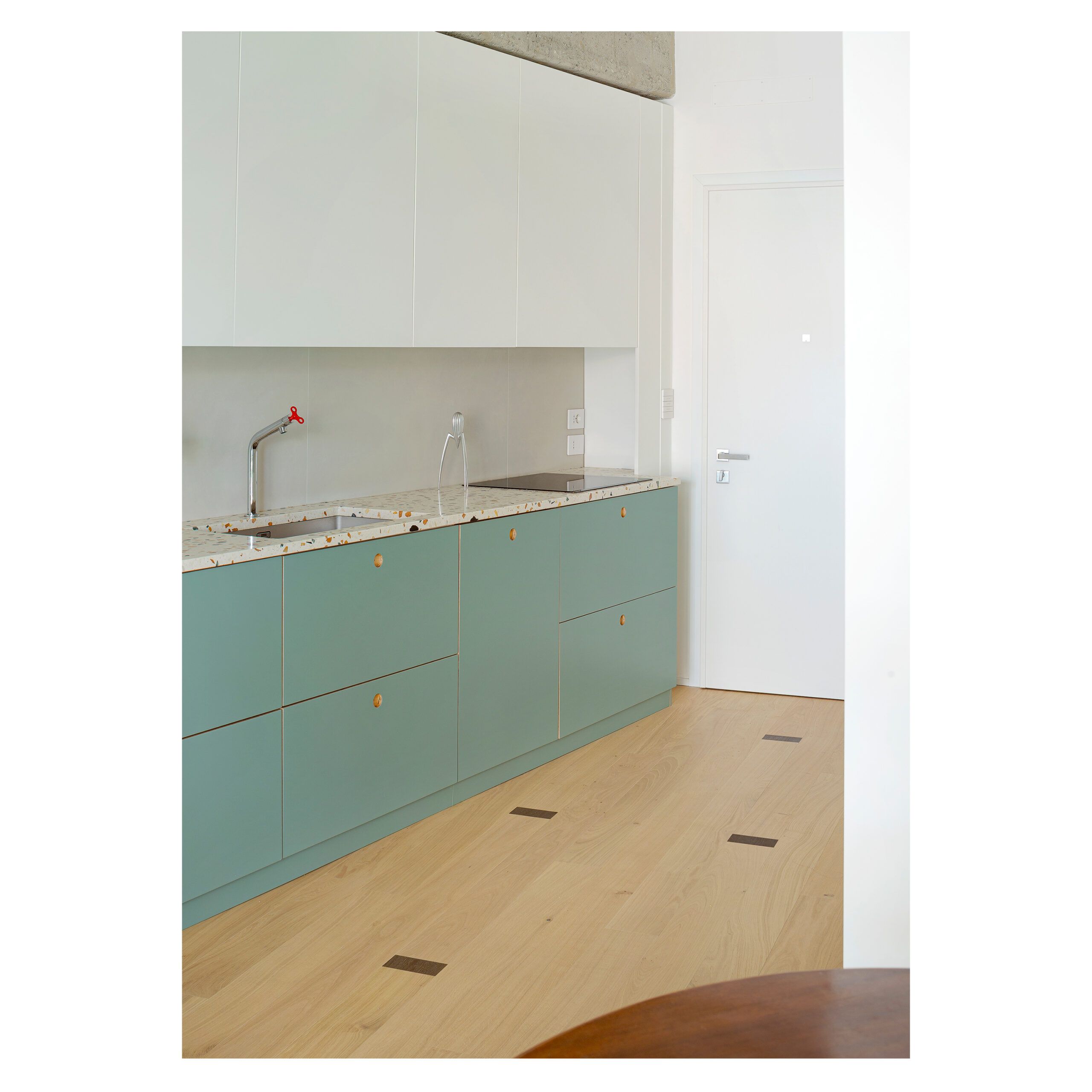 Questa direzione di progetto è stata intrapresa in primis attraverso il parquet, presente nell’open space e nelle 2 camere. Da questa scelta materica per gli ambienti, che possiamo definire usuale, siamo partiti con declinazioni uniche. Il parquet in questo progetto non diviene elemento unificatore ma opportunità di caratterizzazione dei singoli spazi e così nella zona giorno abbiamo optato per un rovere chiaro posato a correre, dove intarsi in legno scuro movimentano e geometrizzano con dolcezza l’ambiente creando dei punti fermi visivi dove tutto è disallineamento e sorpresa. Se il primo tema è eredità degli spazi ed ineludibile elemento, il secondo nasce dalla volontà di portare elementi giocosi ed inusuali così come l’uso del colore rosso per tutte le componenti di “calore”: il termosifone in soggiorno, la luce conica sul tavolo, la testa del rubinetto del lavabo cucina e le montanti del riscaldamento che abbiamo lasciato esterne.