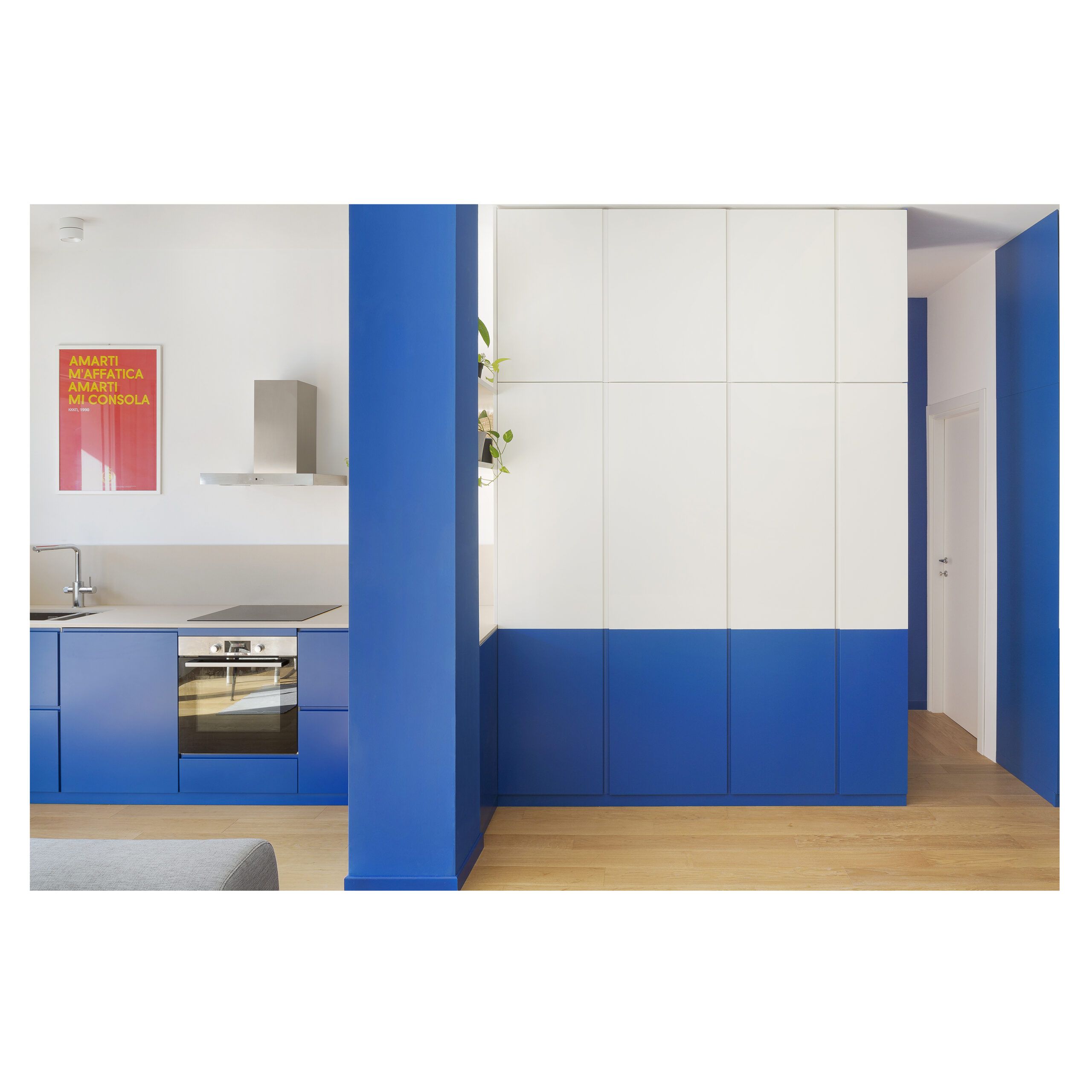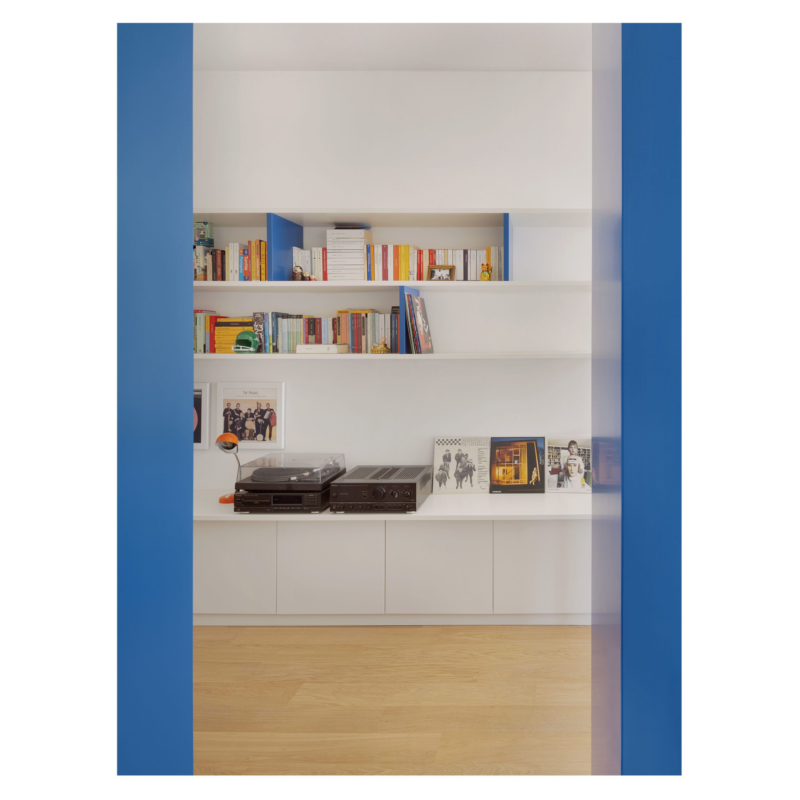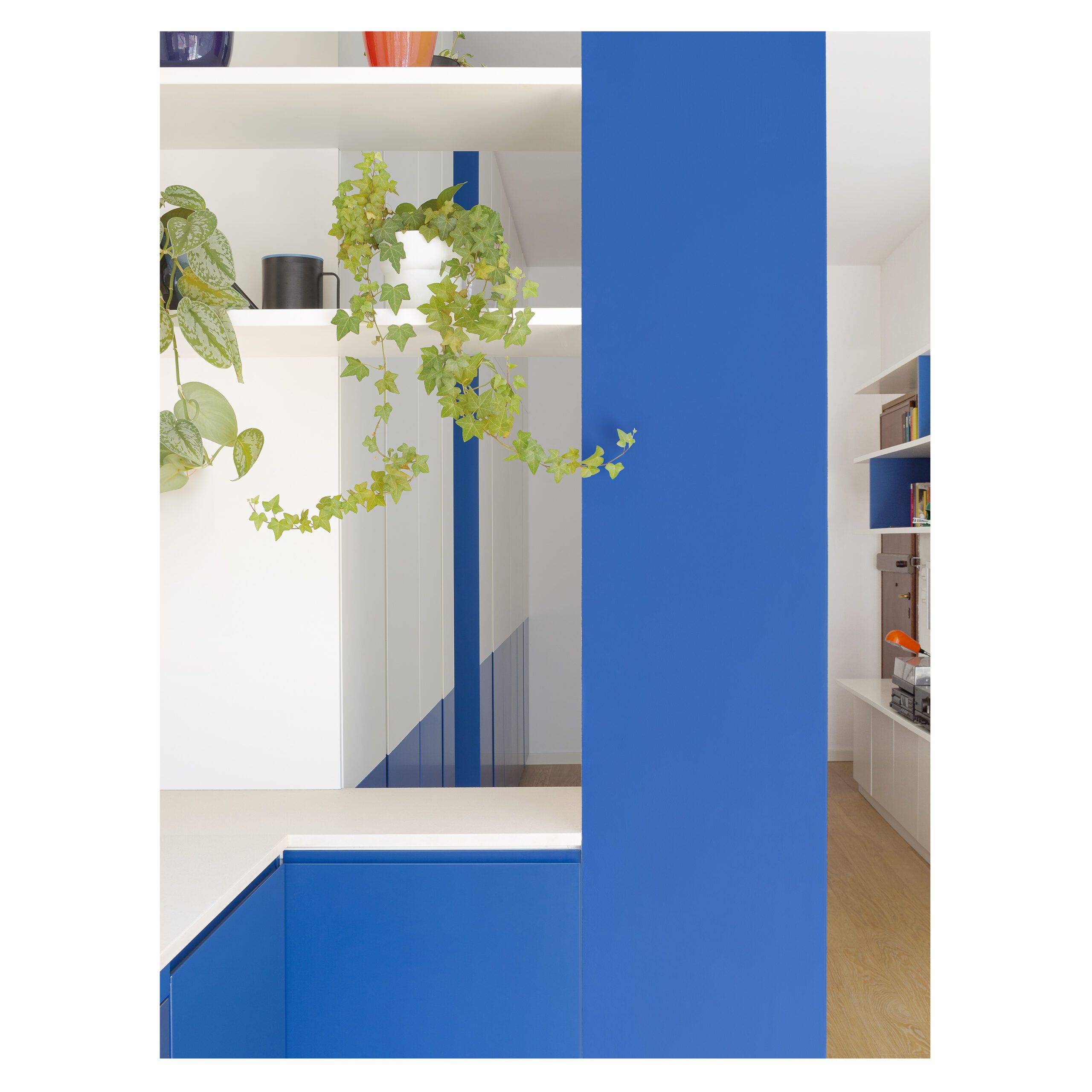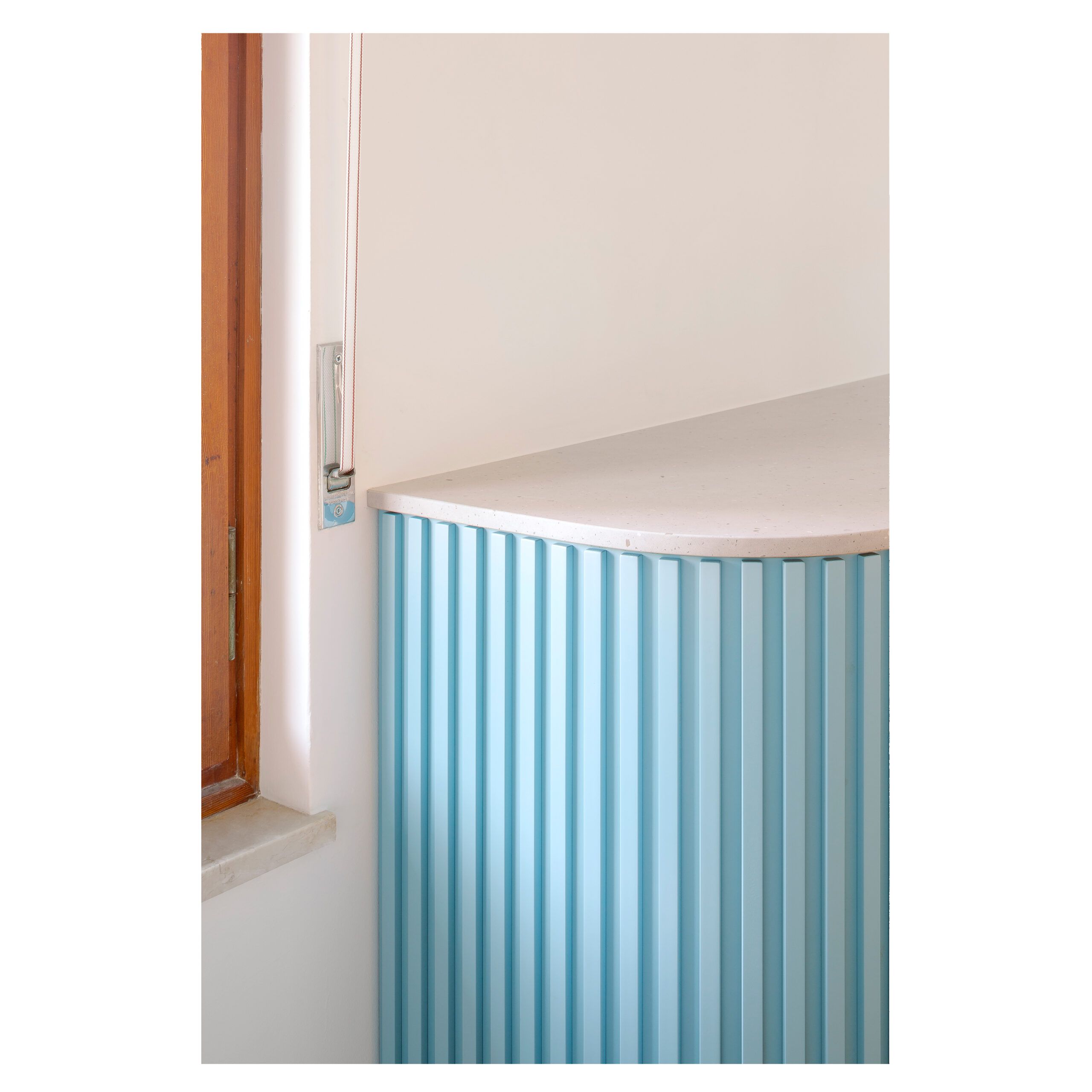 Si ottiene così un’articolazione spaziale in cui cucina e soggiorno sono sempre connessi, ma allo stesso tempo vi sono scorci visuali predominanti ed altri secondari. Nella zona cucina è il mobile basso azzurro che diviene il protagonista prospettico. Questo arredo con un angolo dolce stondato, attraverso la finitura cannettata crea una quinta puntuale e movimentata allo stesso tempo.