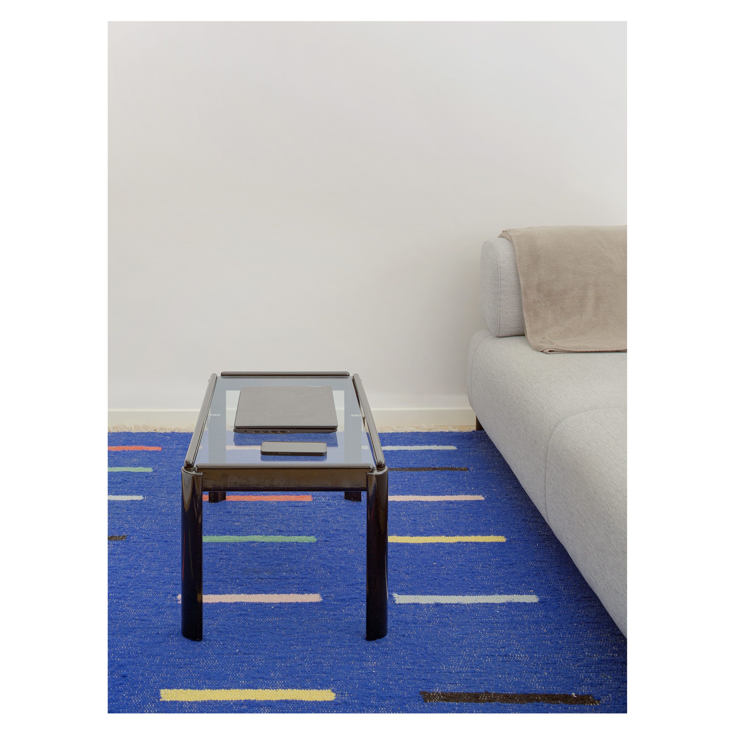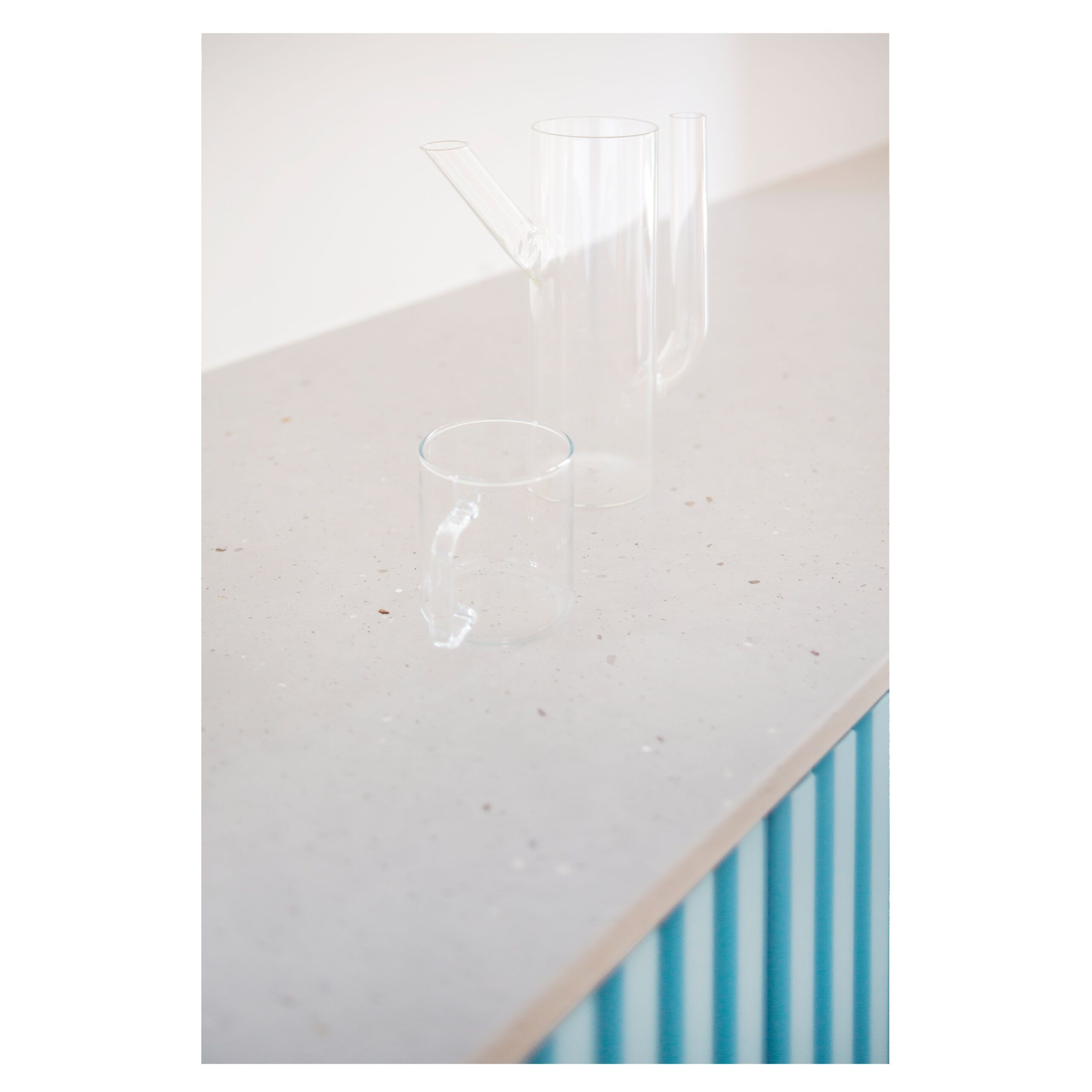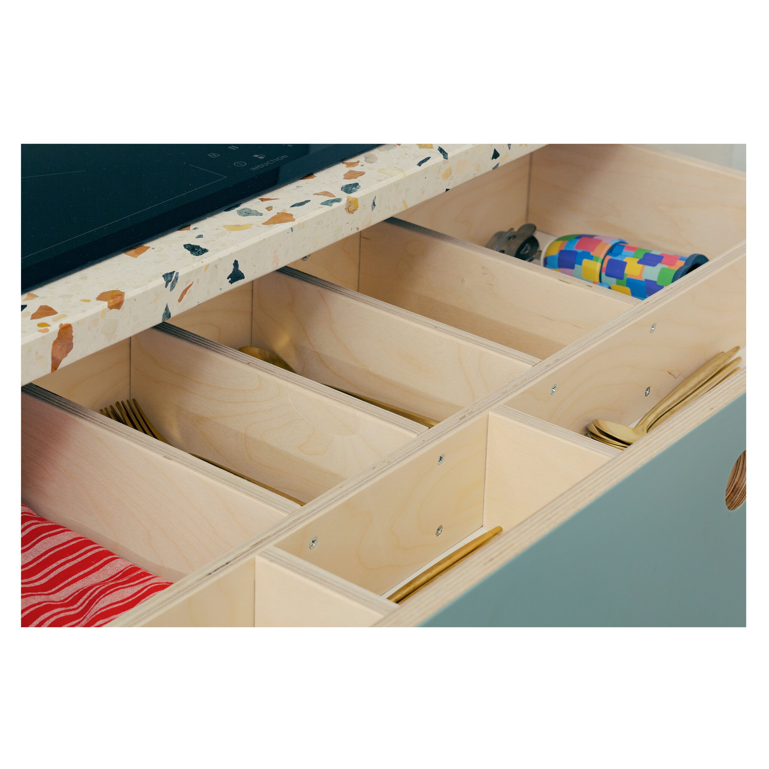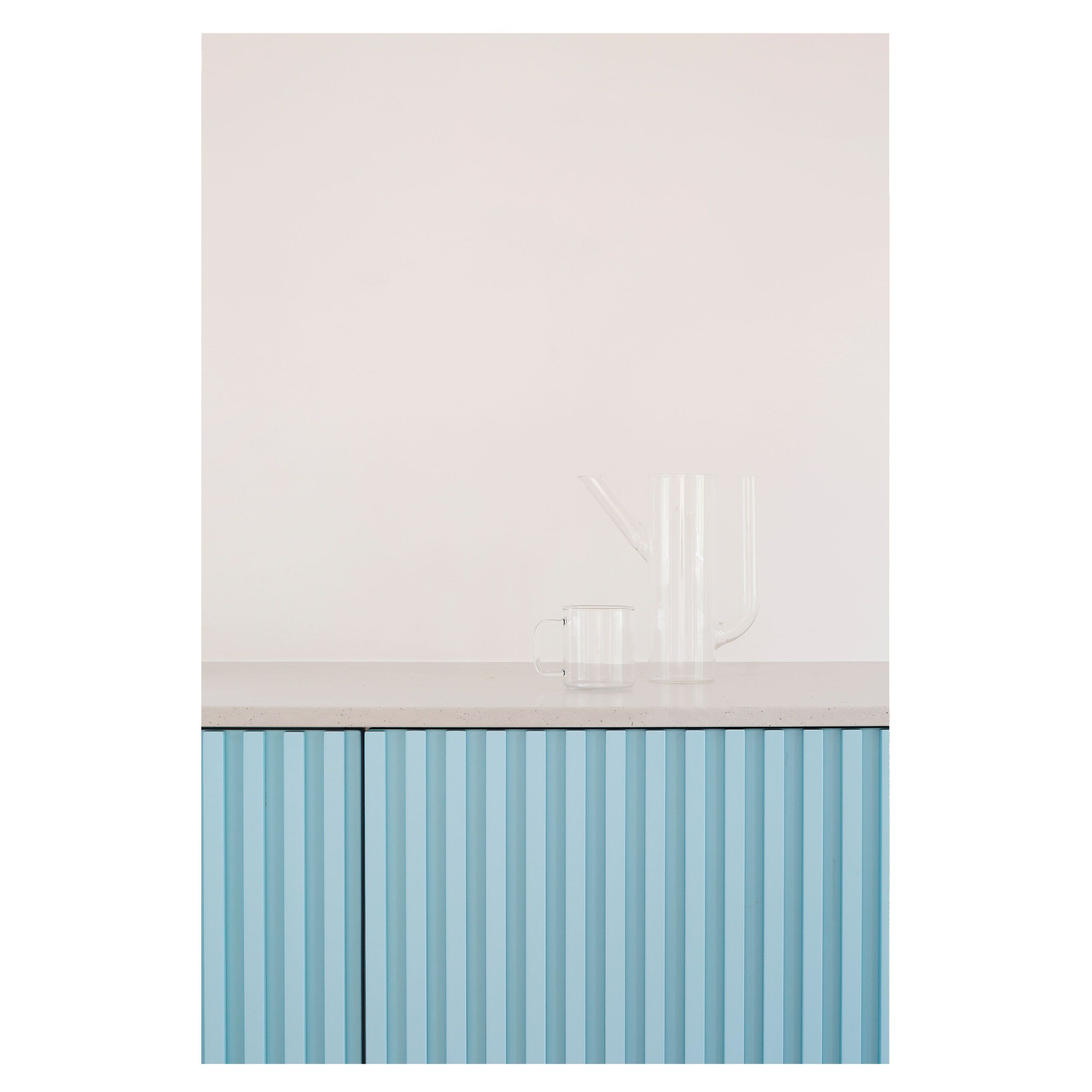 Si ottiene così un’articolazione spaziale in cui cucina e soggiorno sono sempre connessi, ma allo stesso tempo vi sono scorci visuali predominanti ed altri secondari. Nella zona cucina è il mobile basso azzurro che diviene il protagonista prospettico. Questo arredo con un angolo dolce stondato, attraverso la finitura cannettata crea una quinta puntuale e movimentata allo stesso tempo.