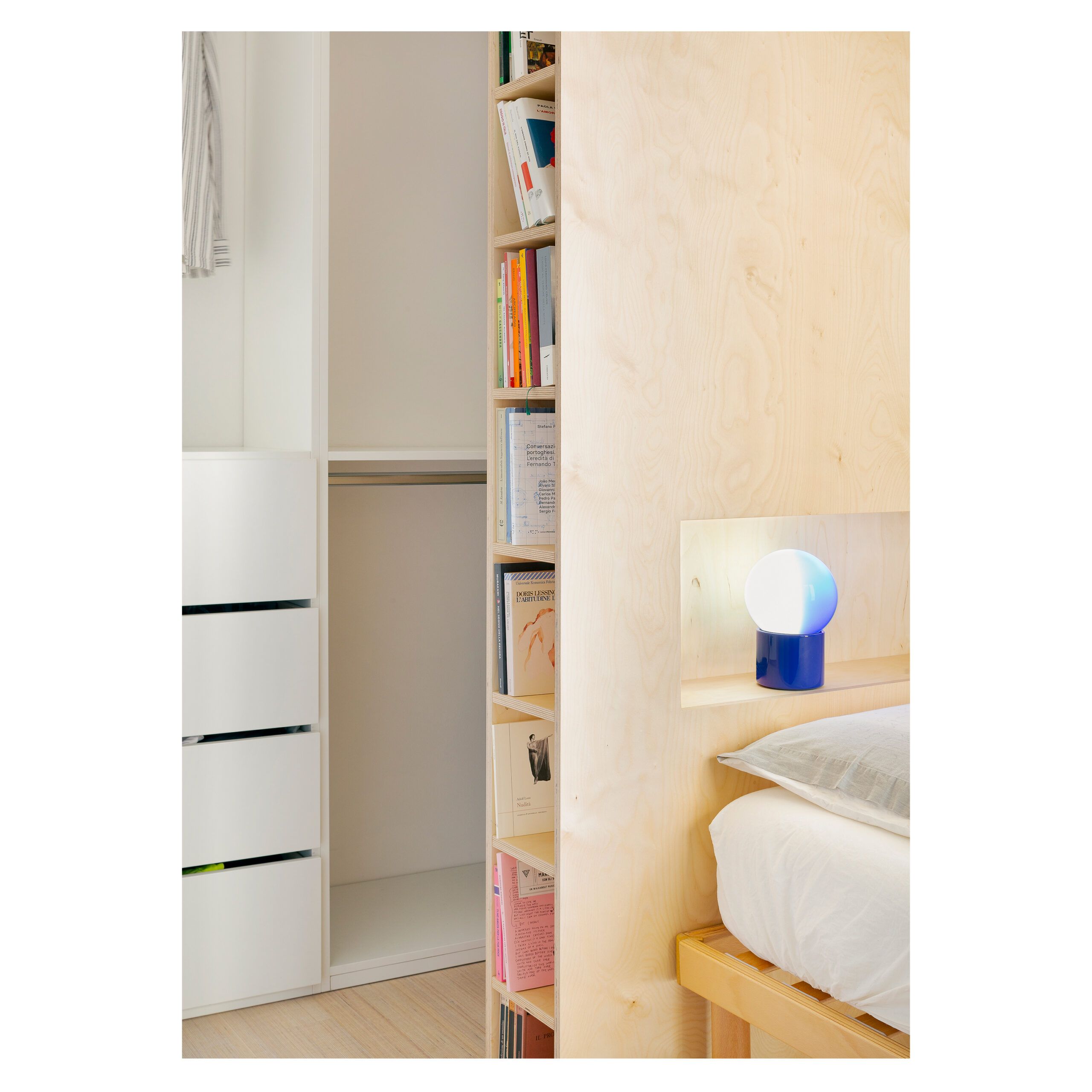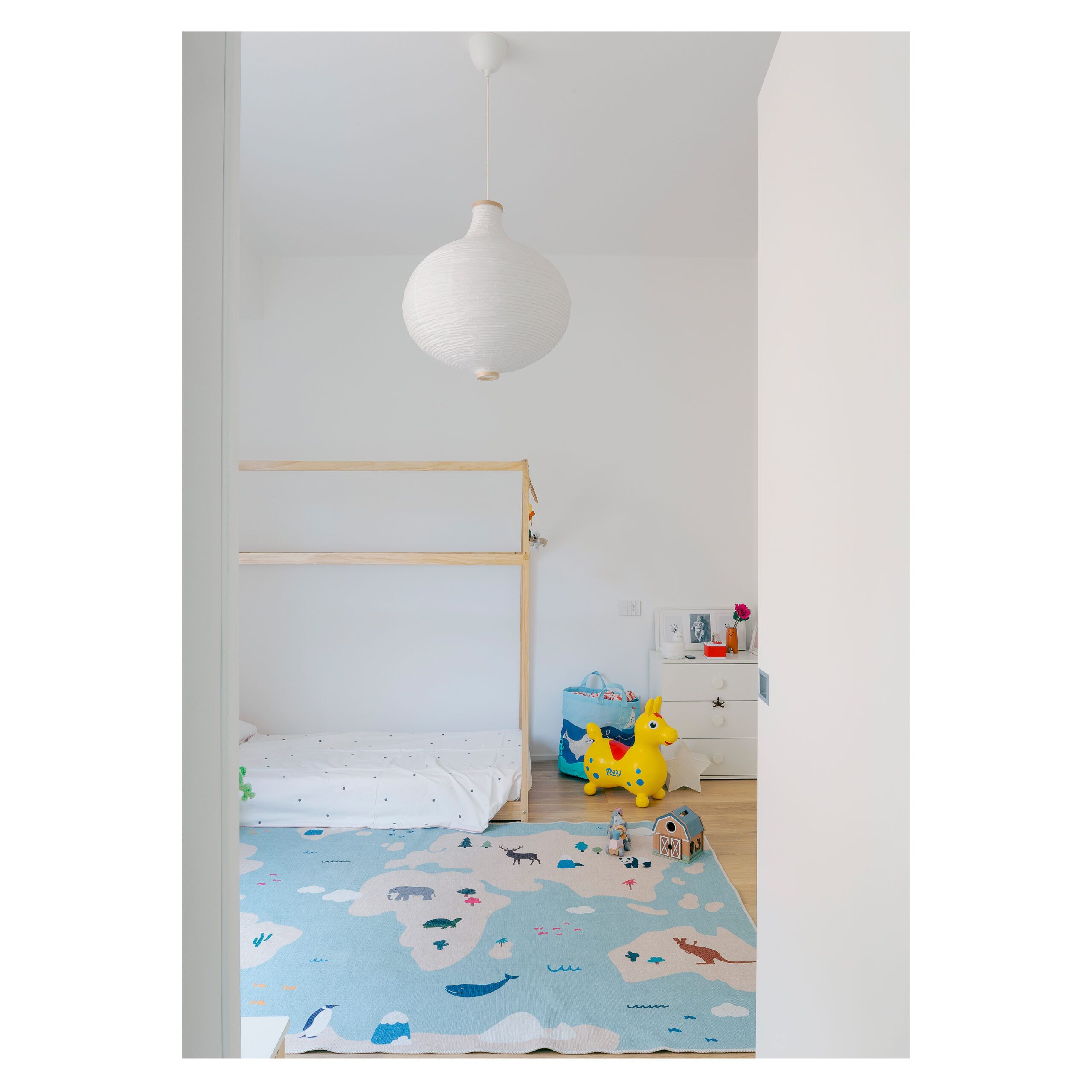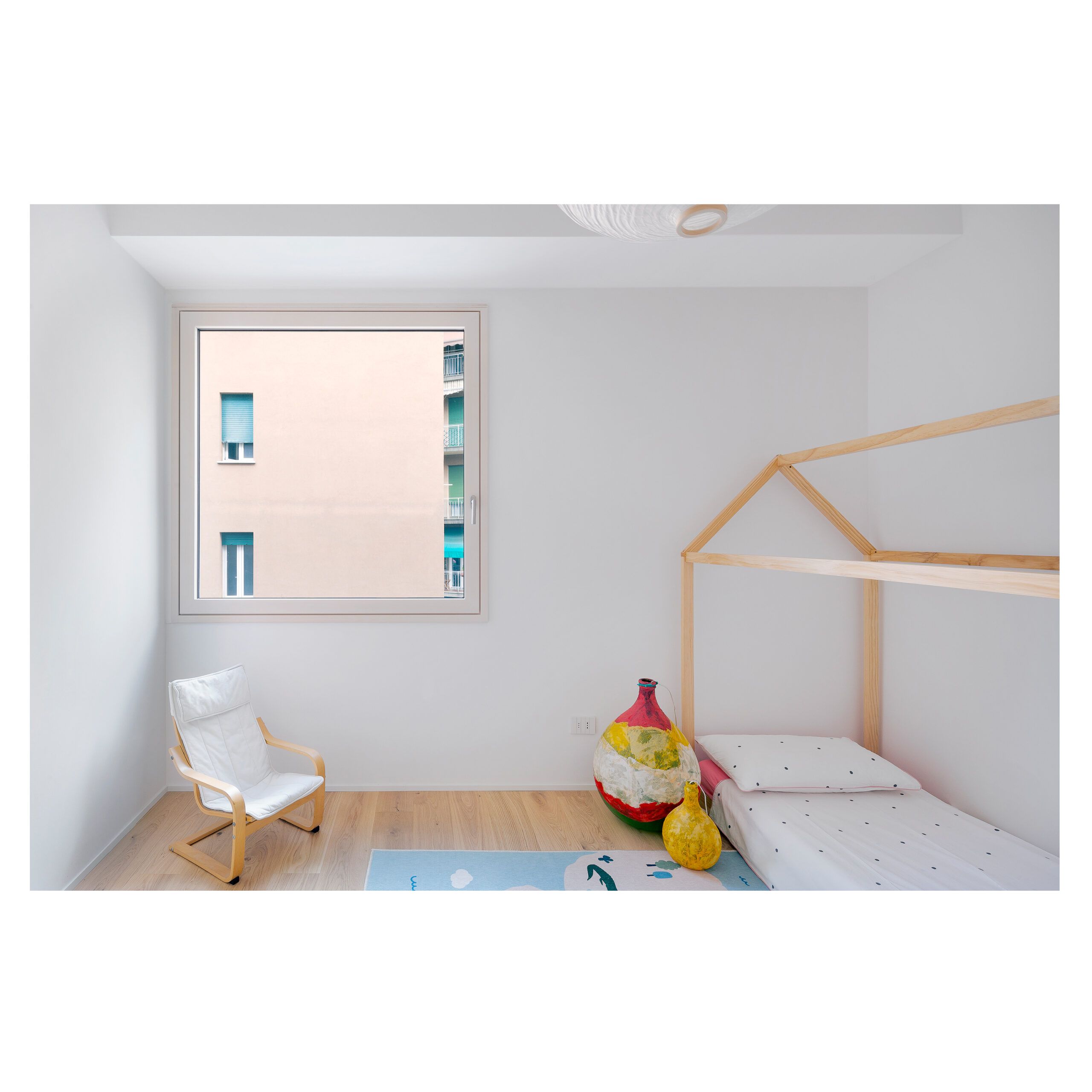 Questo volume netto e snello dello schienale, nasconde il guardaroba in camera ed evita la necessità di un’armadiatura classica. Il rovere a terra ritorna in camera di Dalia, dove l’armadio diviene generoso e minimale al tempo stesso ed in questo ambiente si apprezza ancor più la potenza estetica degli infissi in abete sbiancato con telaio complanare in una apertura ad anta unica delle dimensioni di 1,6×1,6 m. Un grande tappeto colorato, la cucina gioco, l’angolo libreria sempre in betulla ed il letto che richiama l’archetipo casa sono i protagonisti di questa stanza, dove colori e giustapposizioni ludiche sono i protagonisti.