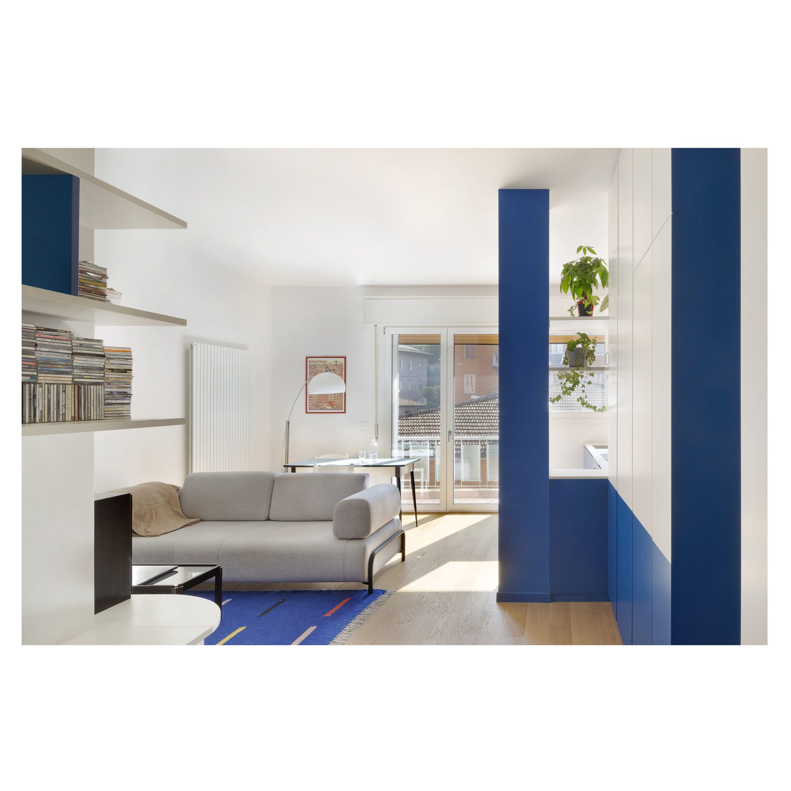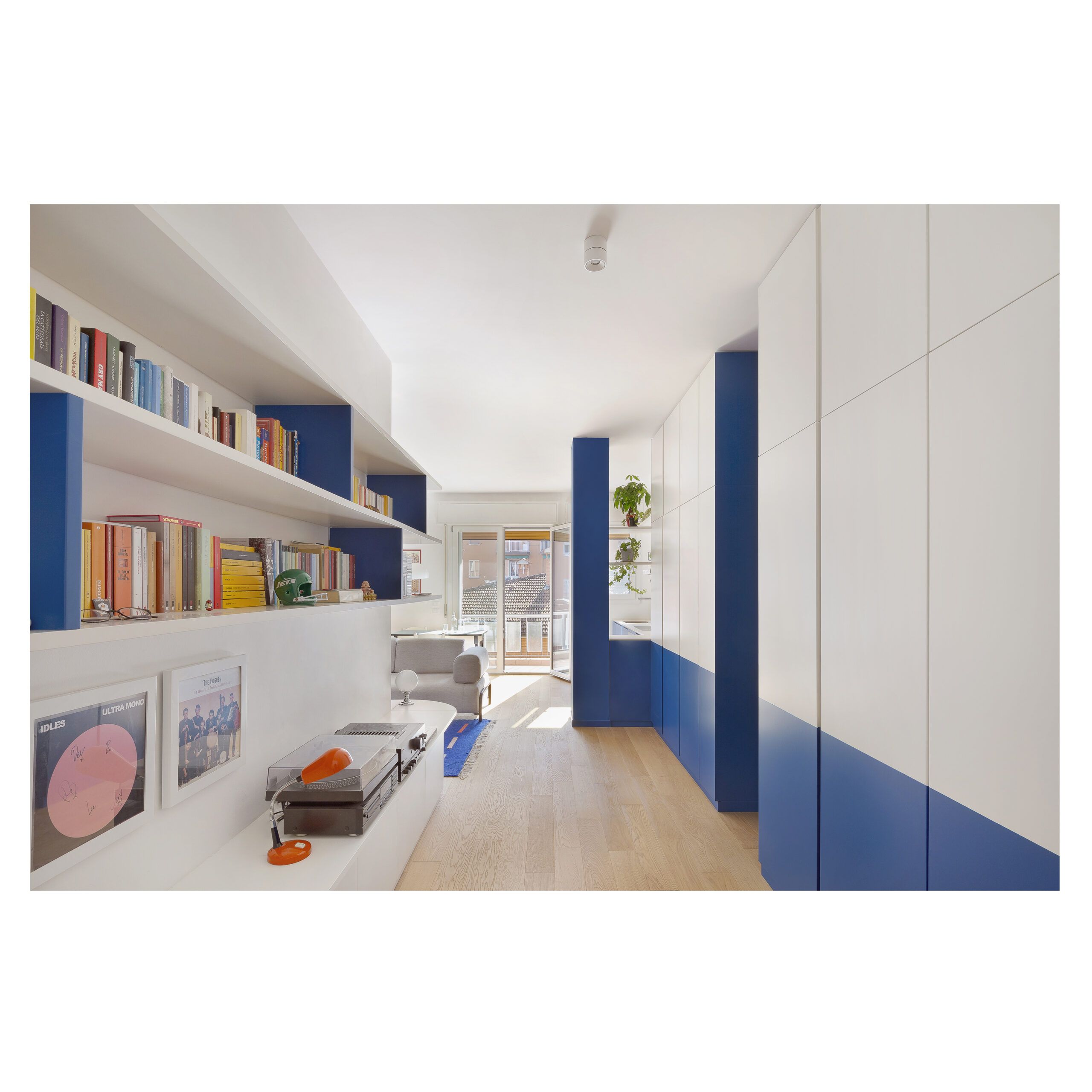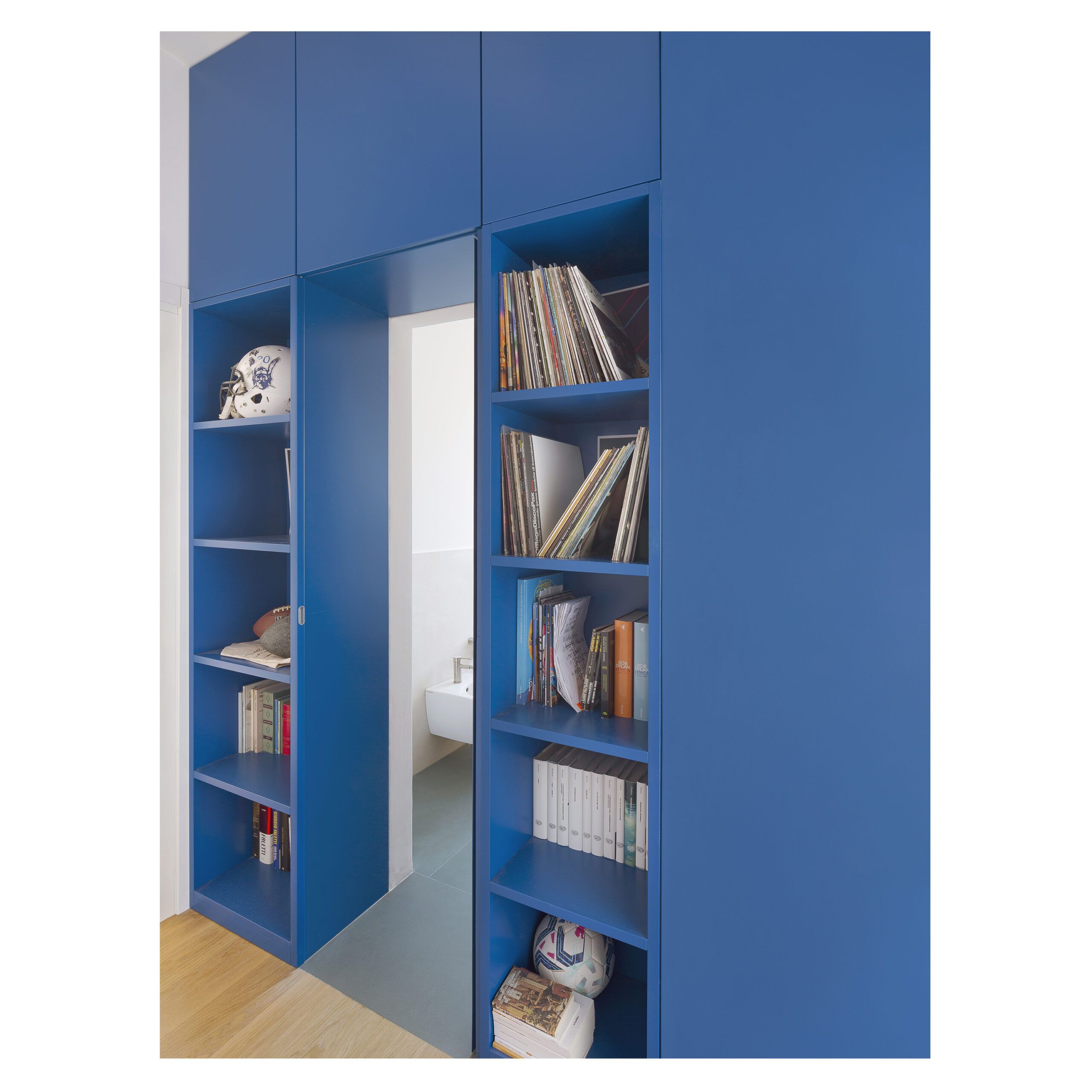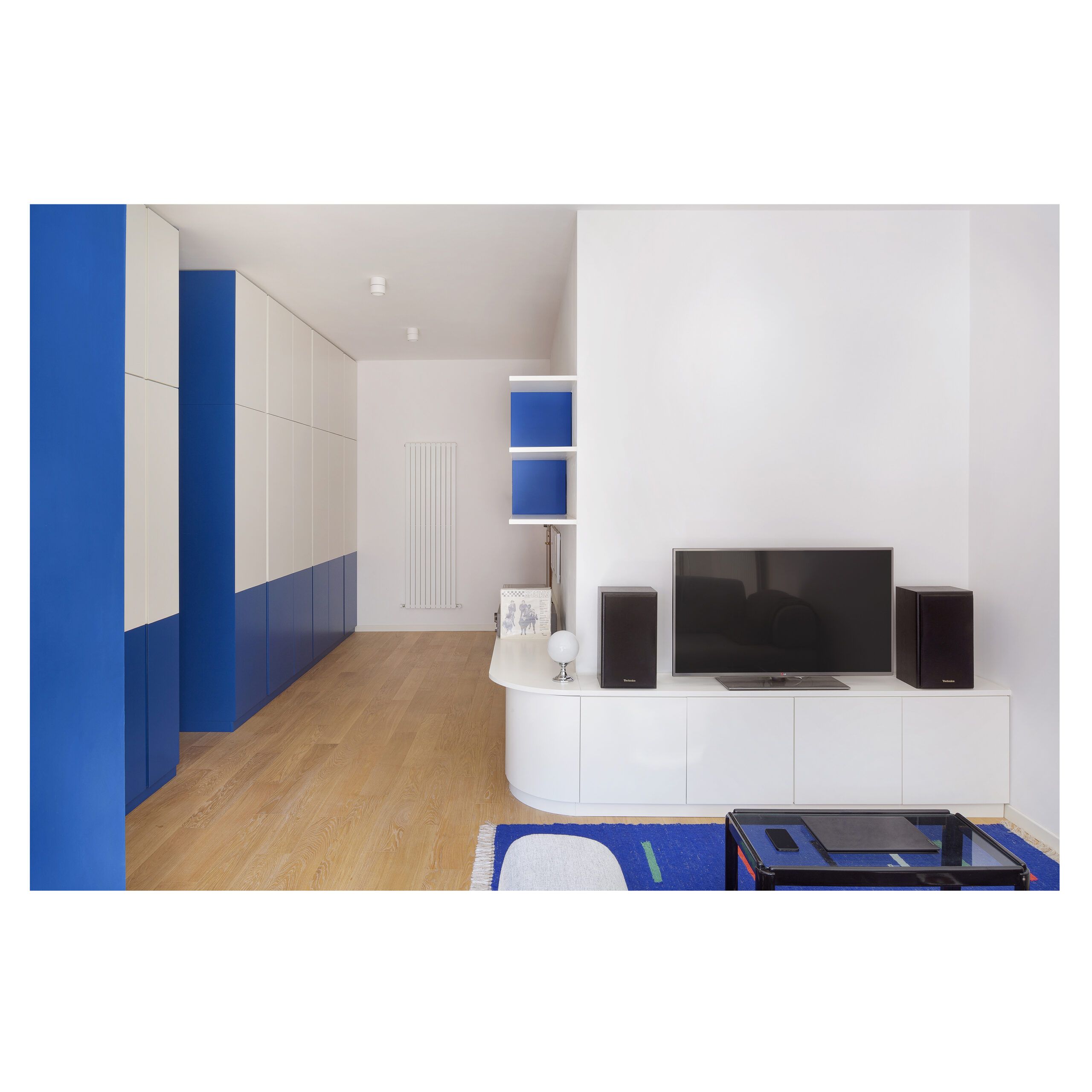 Tutti gli elementi che avrebbero potuto “sporcare” formalmente il progetto, sono divenuti occasione per caratterizzarlo. Così, il vecchio disimpegno tra bagno e camera, é stato ridotto per far posto alla nuova lavanderia. Il volume di quest’ultima é stato volutamente espresso ed individuato dal colore blu, per celare il disallineamento che si sarebbe presentato tra la parete lavanderia e quella lato divano.