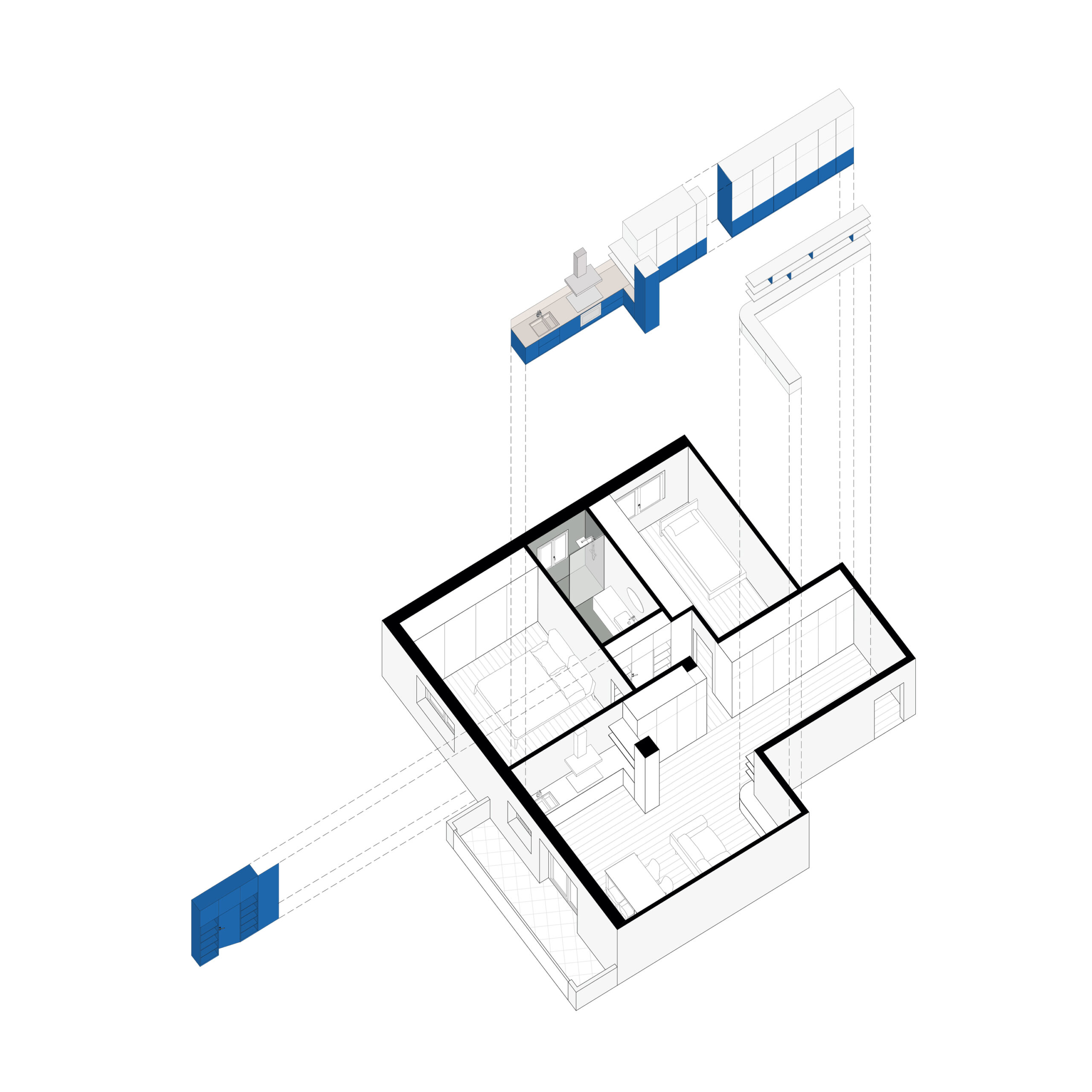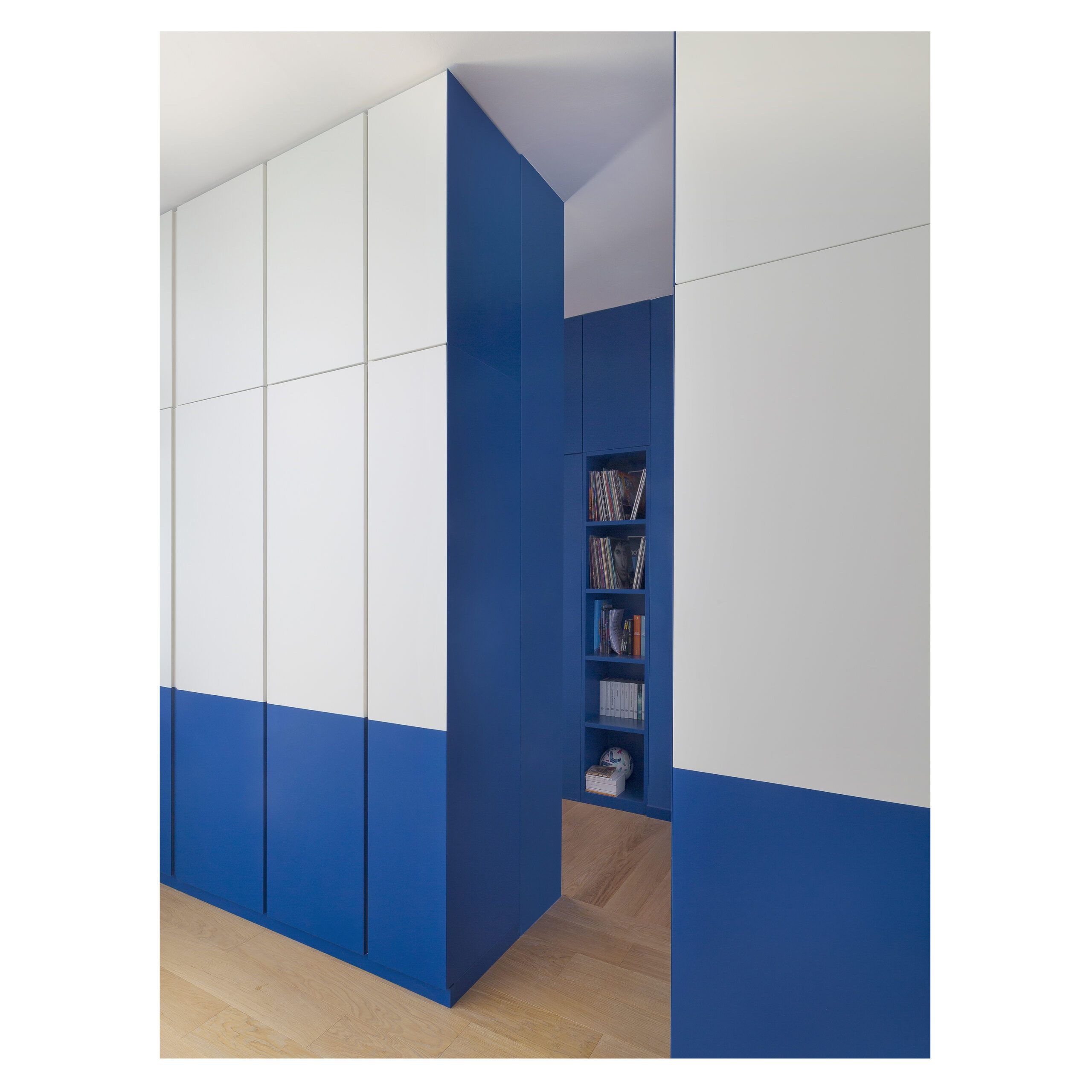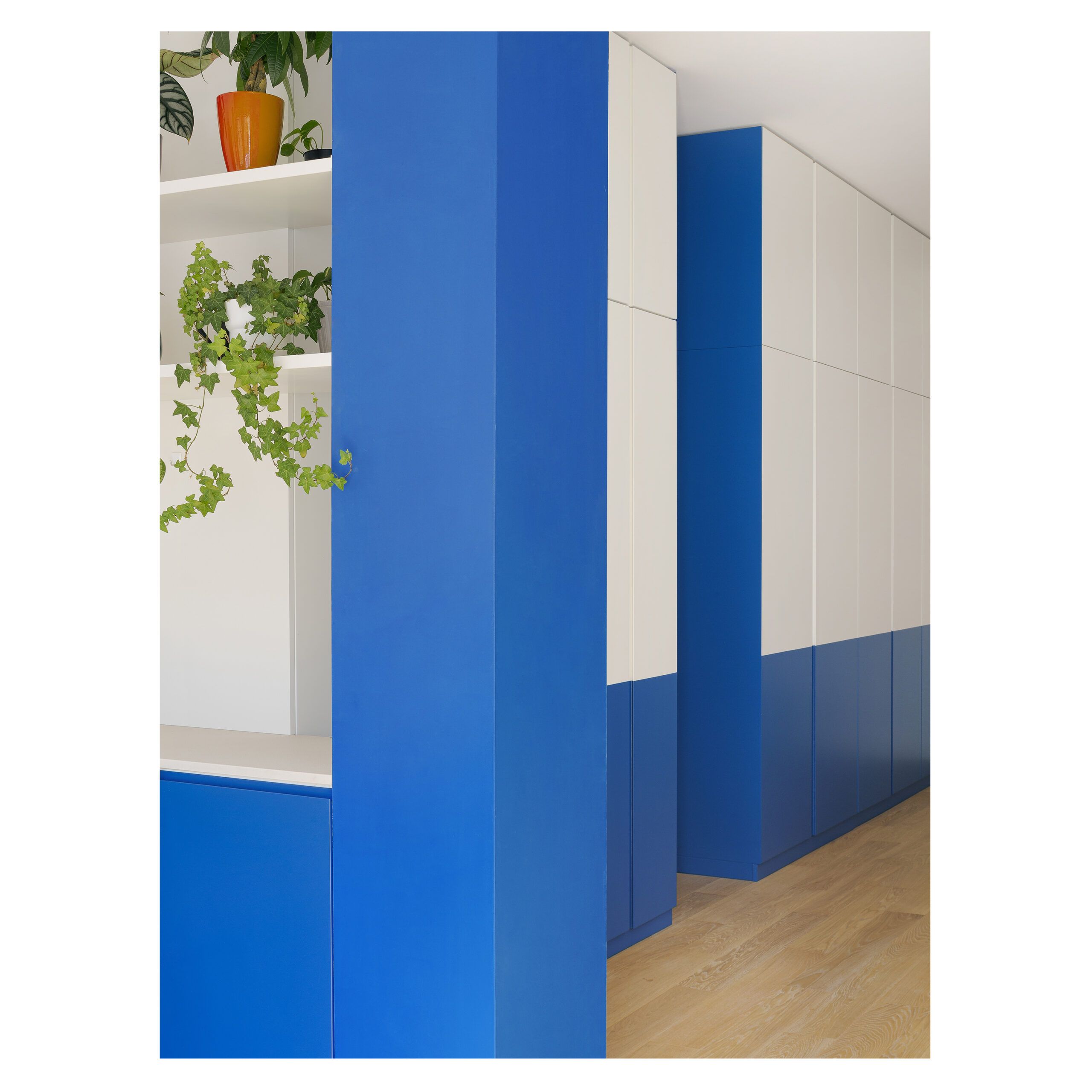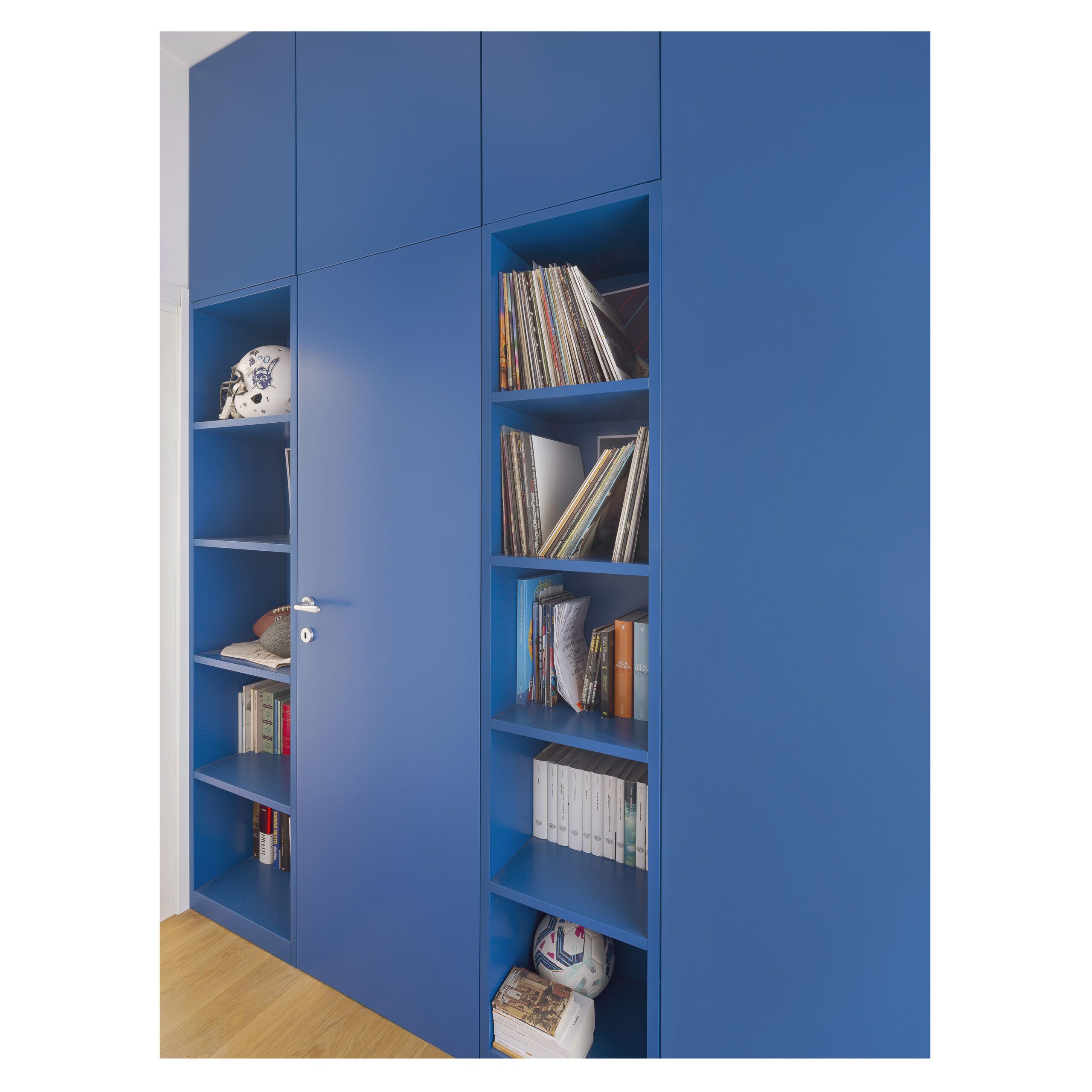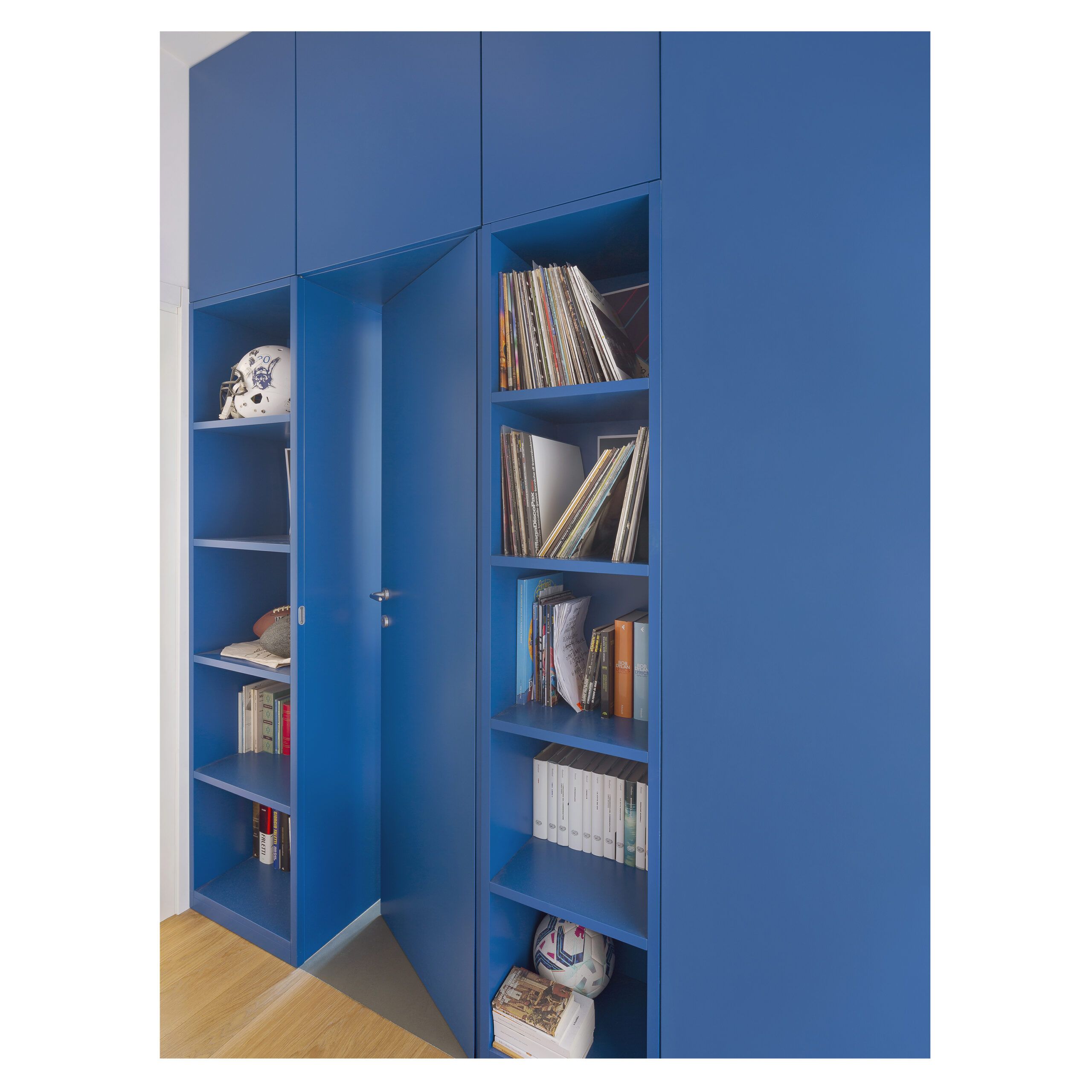 Tutti gli elementi che avrebbero potuto “sporcare” formalmente il progetto, sono divenuti occasione per caratterizzarlo. Così, il vecchio disimpegno tra bagno e camera, é stato ridotto per far posto alla nuova lavanderia. Il volume di quest’ultima é stato volutamente espresso ed individuato dal colore blu, per celare il disallineamento che si sarebbe presentato tra la parete lavanderia e quella lato divano.