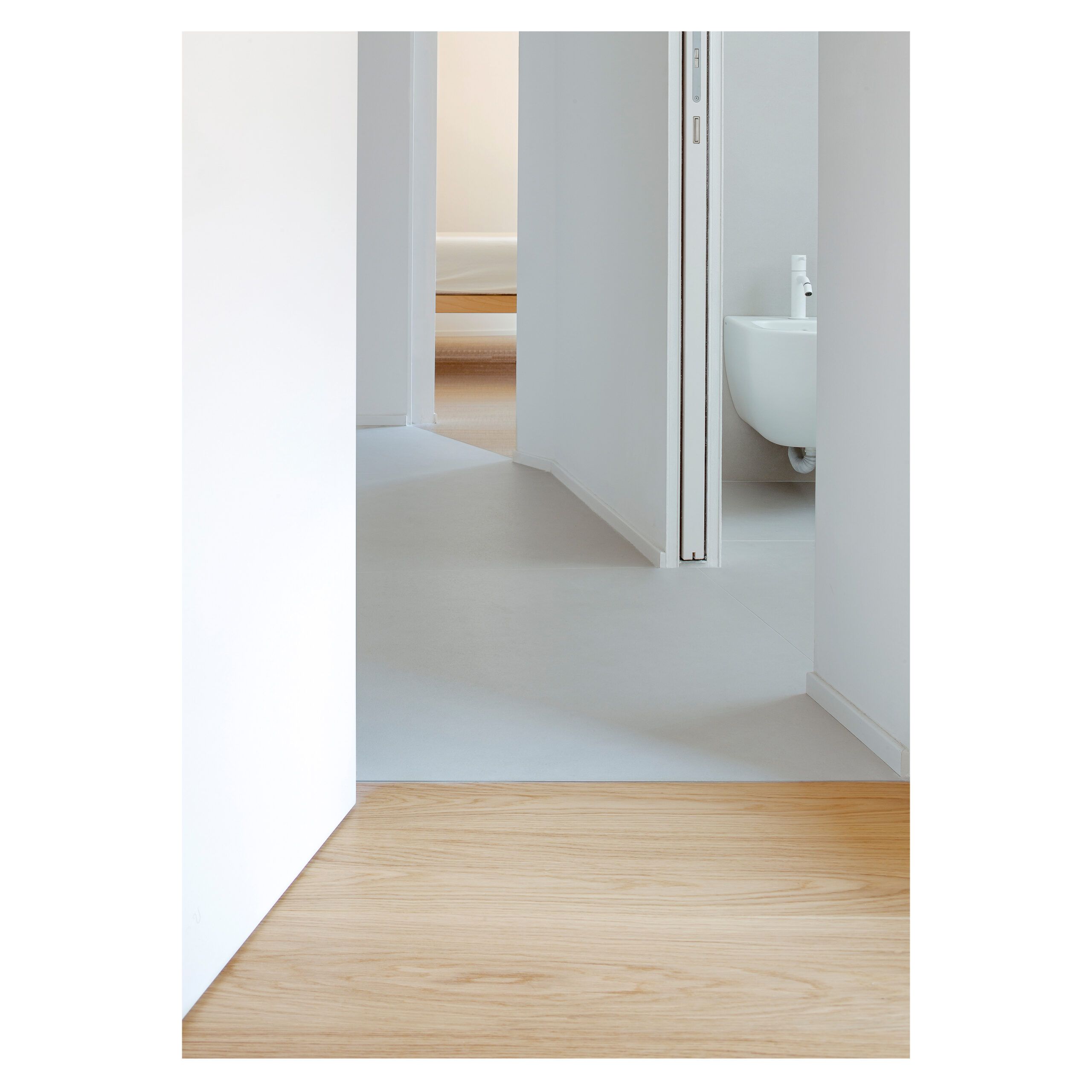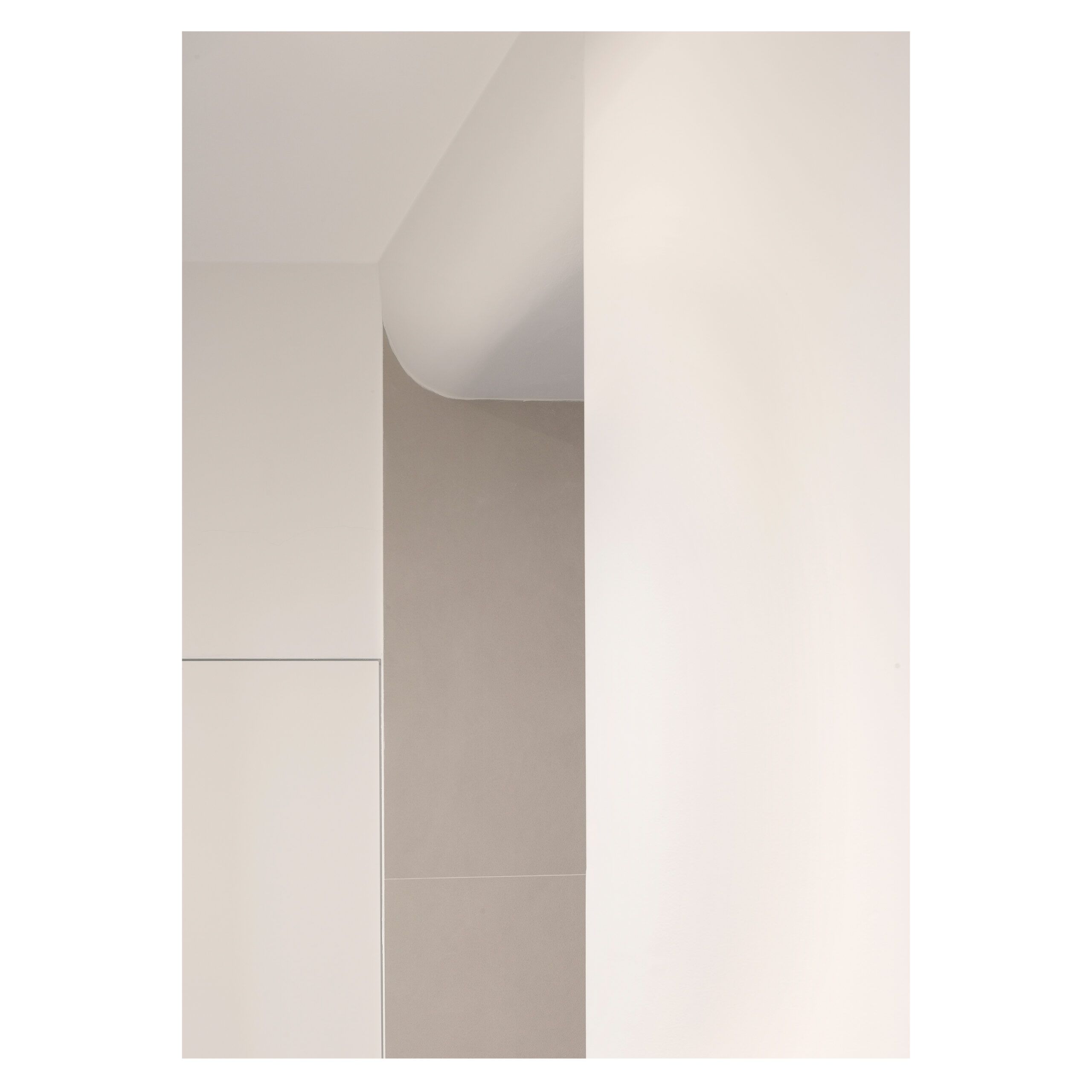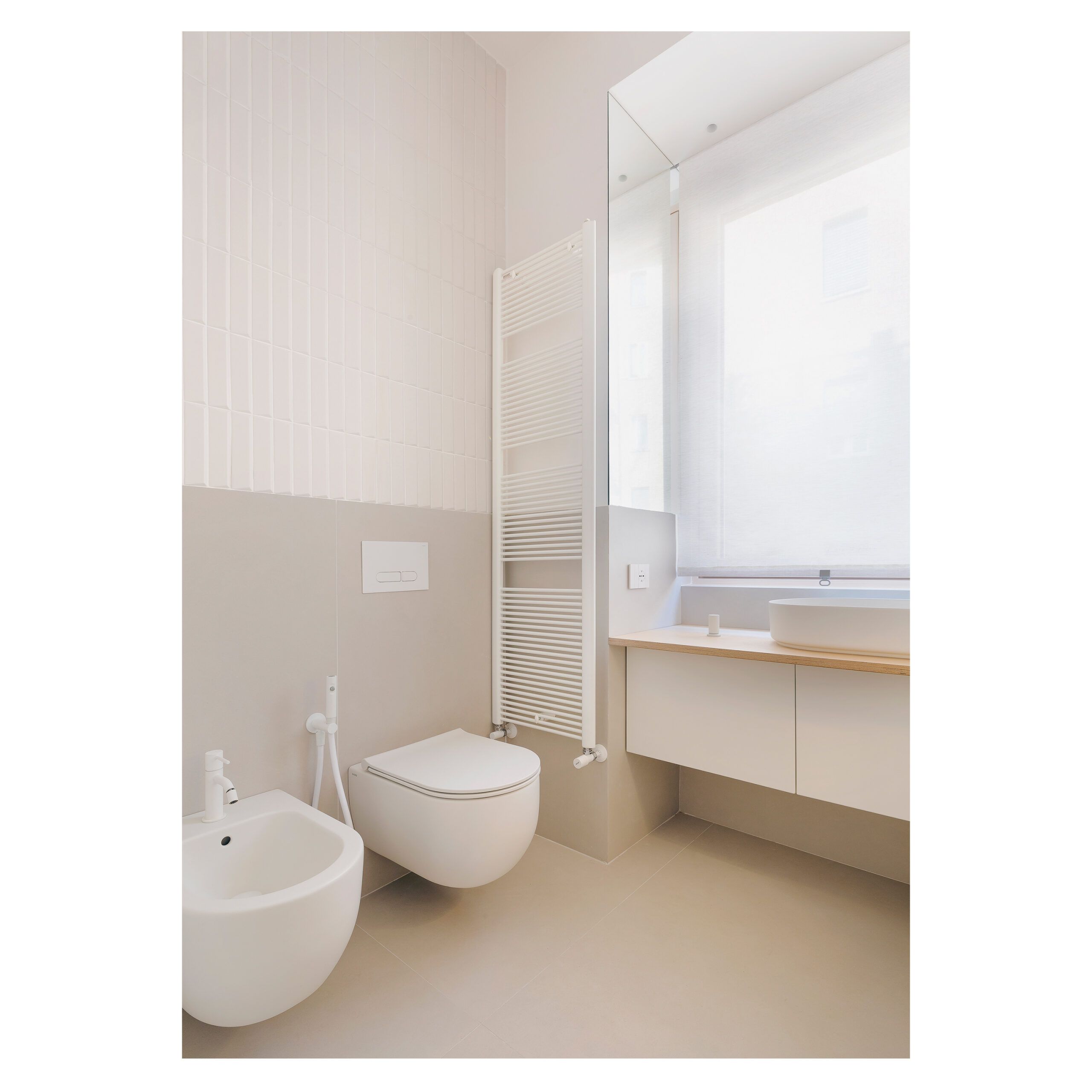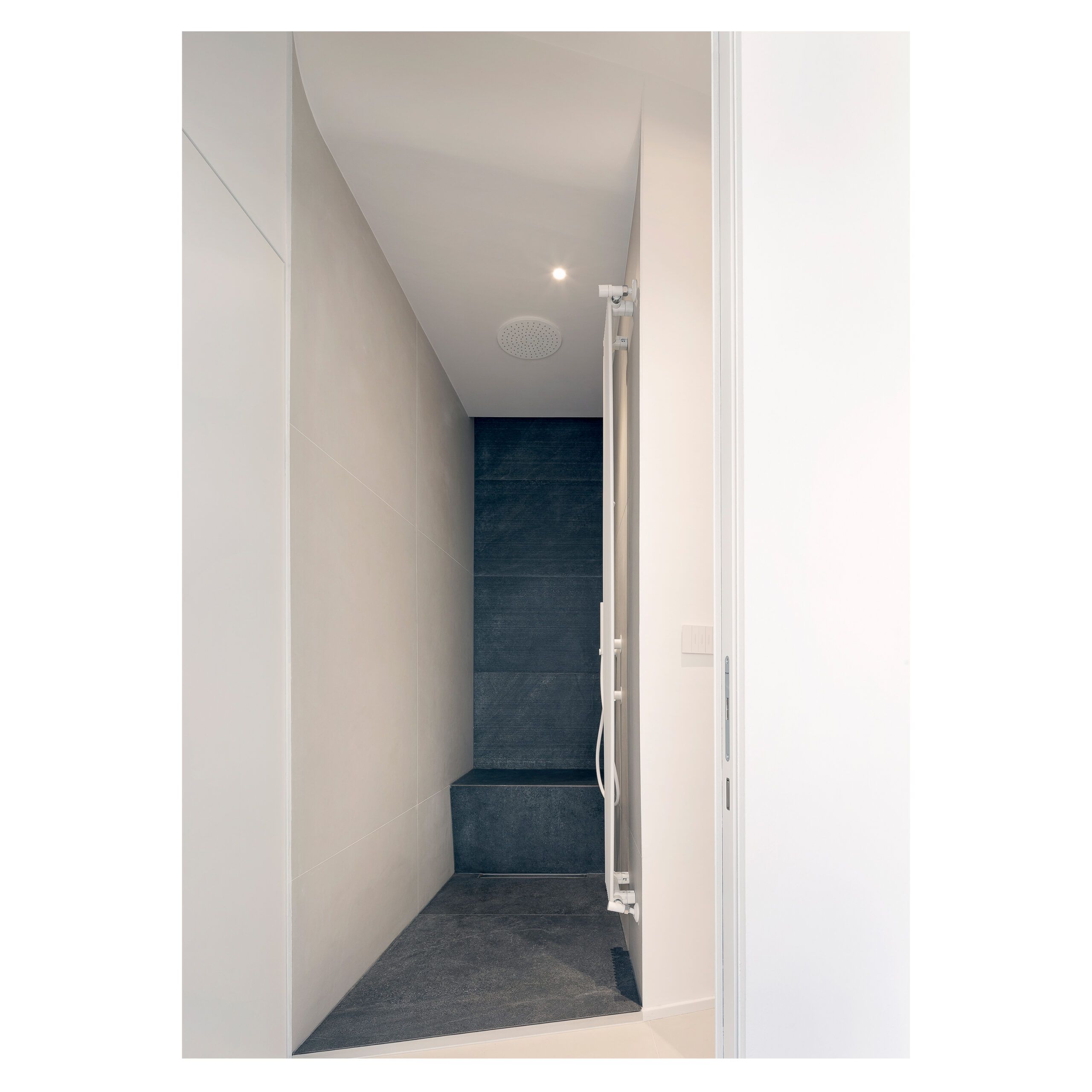 Se quanto descritto fino ad ora colpisce entrando in casa B.V, la vera raffinatezza progettuale e compositiva, si avverte, a nostro avviso, nella zona meno protagonista solitamente e più strettamente relegata a mera funzione e collegamento ossia nella zona corridoio e distribuzione che collega zona giorno e camere. La geometria pensata ha permesso di evitare la porta tra open space e zona notte. Il grès grande formato bianco raccorda elegantemente ed in maniera neutrale i tre diversi parquet. Senza che il visitatore se ne accorga, si fa fondale ma rimane protagonista per far risaltare il bianco totale del bagno dove anche la rubinetteria ed i sanitari bianco-opaco, insieme allo specchio al lato del lavabo, aiutano ad aumentare le ridotte dimensioni e soprattutto introduce il cubo nero della doccia. Anche questa si inserisce per contrasto, così come le illuminazioni LED nell’open space a contatto del cemento della travatura. Anche il corridoio non viene percepito come spazio di distribuzione ma luogo minimale e opaco dove transitare affinché le altre stanze possano brillare. La naturalezza passa anche per l’ardire di dividere doccia da bagno ed aumentare ancor più la non ortogonalità degli spazi. La decisione di inserire nella nostra casa ciò che in questi anni di lavoro abbiamo sperimentato e che ci crea gioia e benessere, è stata presa perché siamo convinti che sia questo ciò che davvero porti alla funzionalità abitativa.