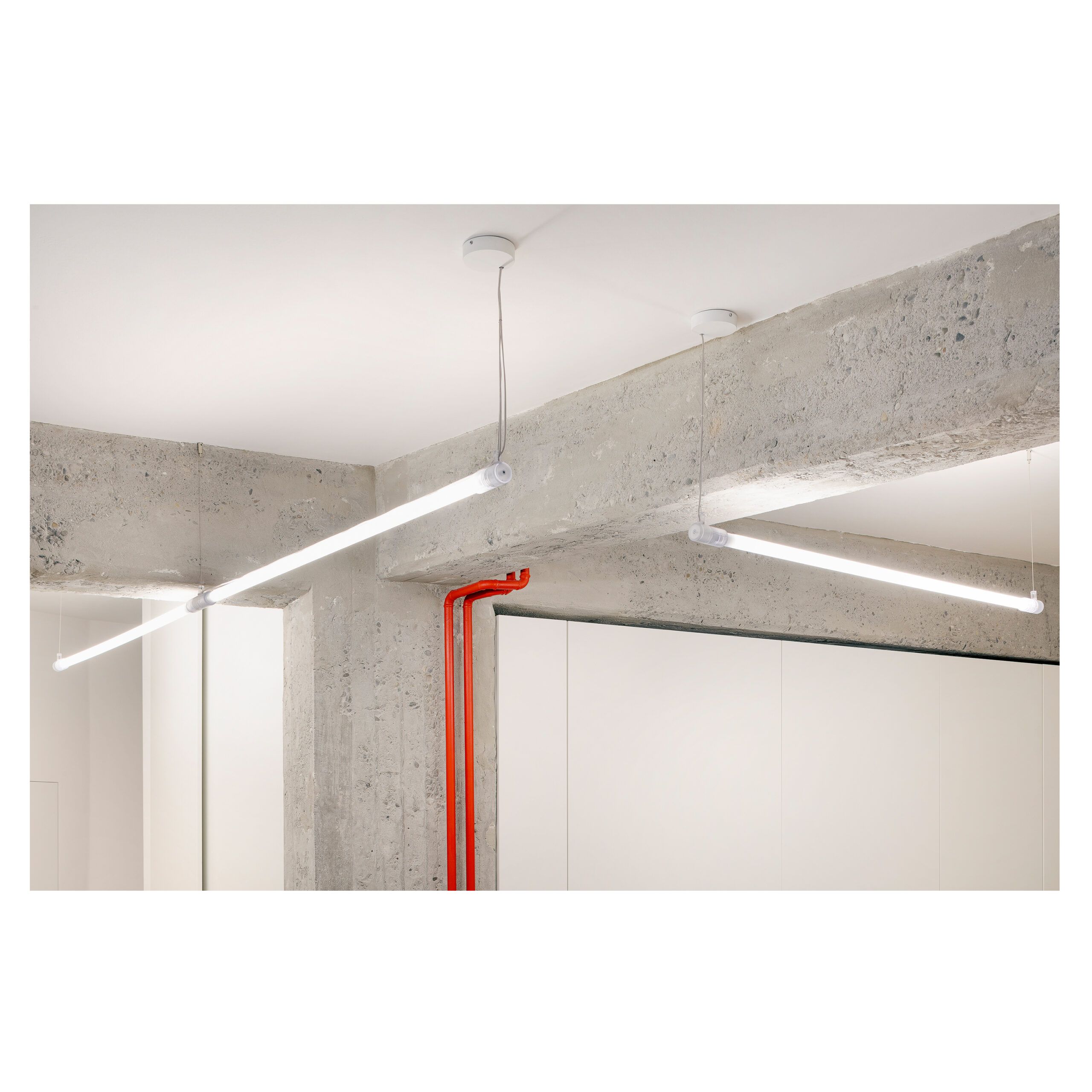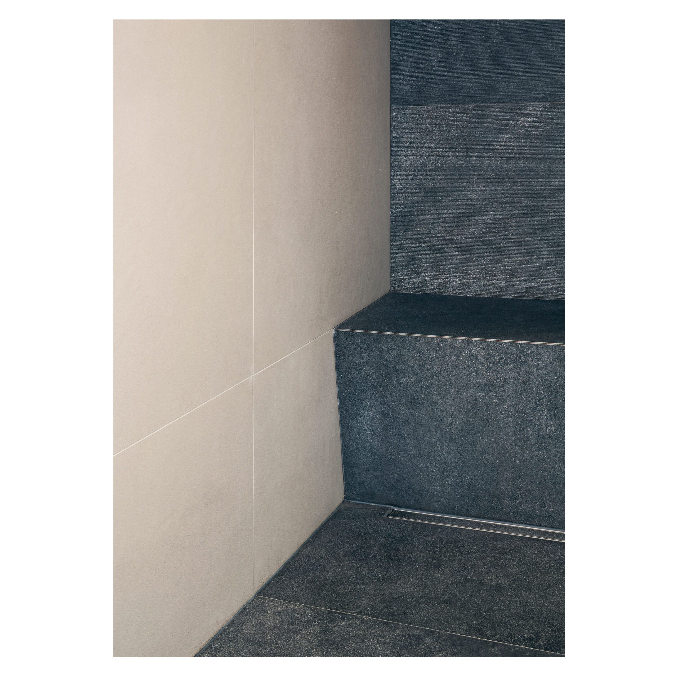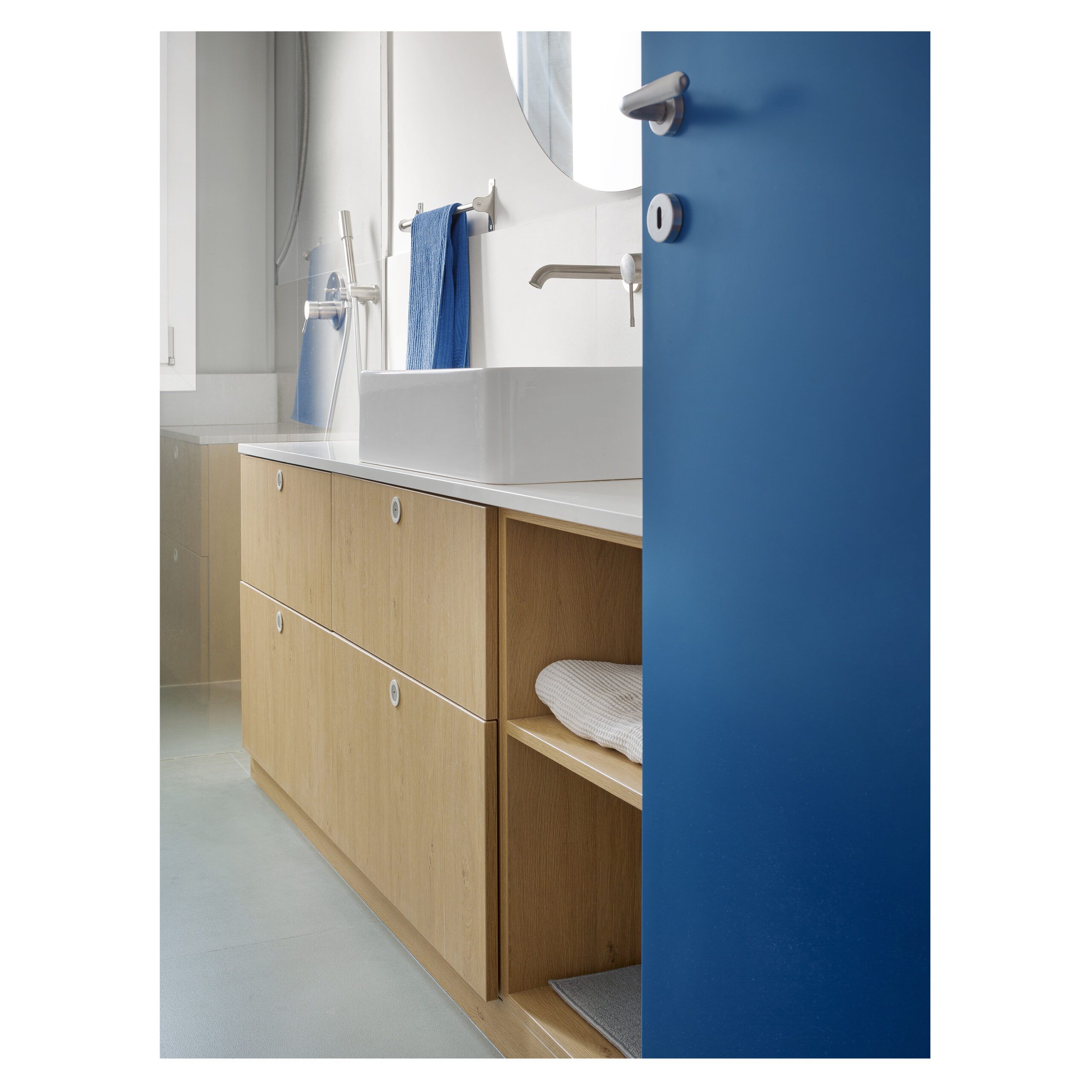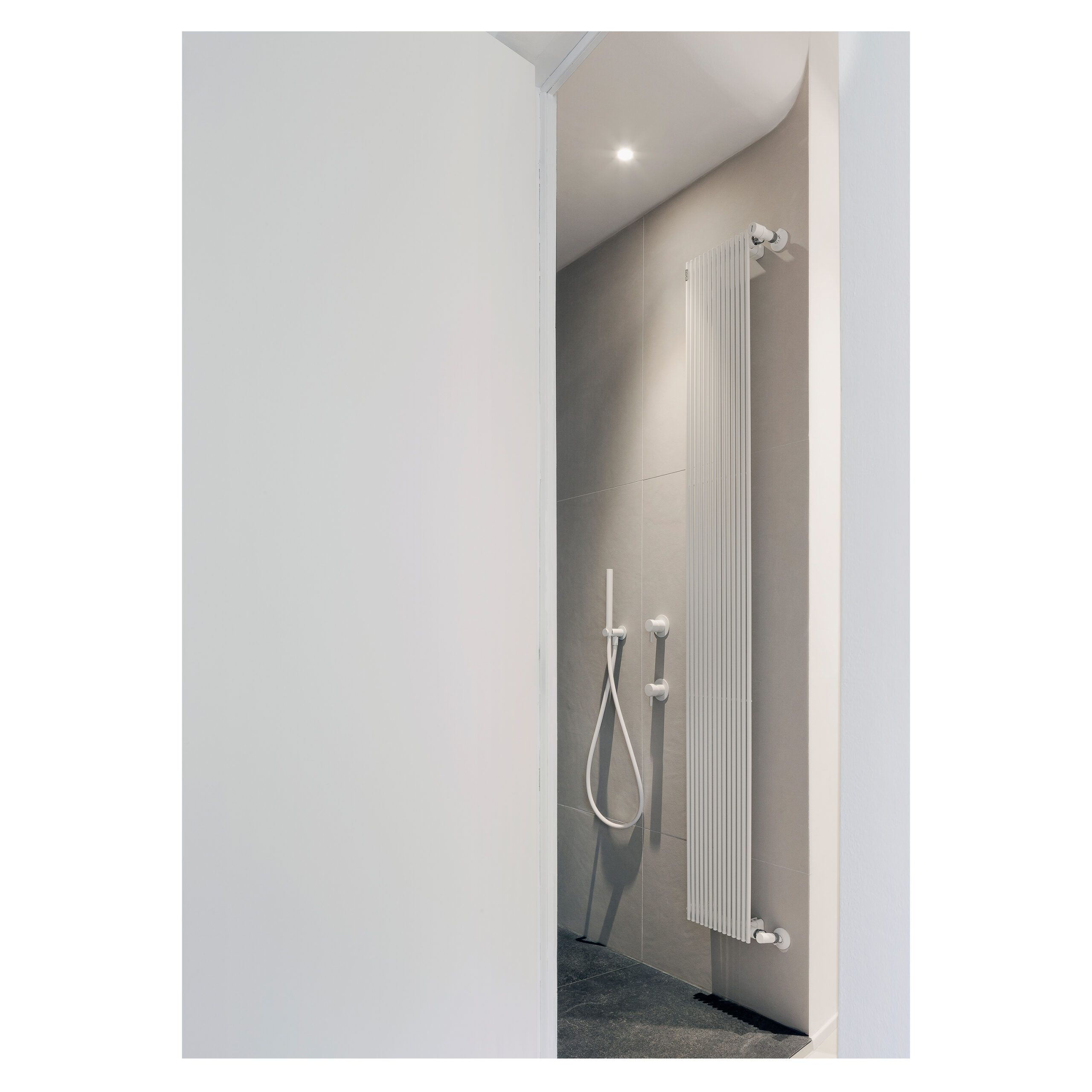 Se quanto descritto fino ad ora colpisce entrando in casa B.V, la vera raffinatezza progettuale e compositiva, si avverte, a nostro avviso, nella zona meno protagonista solitamente e più strettamente relegata a mera funzione e collegamento ossia nella zona corridoio e distribuzione che collega zona giorno e camere. La geometria pensata ha permesso di evitare la porta tra open space e zona notte. Il grès grande formato bianco raccorda elegantemente ed in maniera neutrale i tre diversi parquet. Senza che il visitatore se ne accorga, si fa fondale ma rimane protagonista per far risaltare il bianco totale del bagno dove anche la rubinetteria ed i sanitari bianco-opaco, insieme allo specchio al lato del lavabo, aiutano ad aumentare le ridotte dimensioni e soprattutto introduce il cubo nero della doccia. Anche questa si inserisce per contrasto, così come le illuminazioni LED nell’open space a contatto del cemento della travatura. Anche il corridoio non viene percepito come spazio di distribuzione ma luogo minimale e opaco dove transitare affinché le altre stanze possano brillare. La naturalezza passa anche per l’ardire di dividere doccia da bagno ed aumentare ancor più la non ortogonalità degli spazi. La decisione di inserire nella nostra casa ciò che in questi anni di lavoro abbiamo sperimentato e che ci crea gioia e benessere, è stata presa perché siamo convinti che sia questo ciò che davvero porti alla funzionalità abitativa.