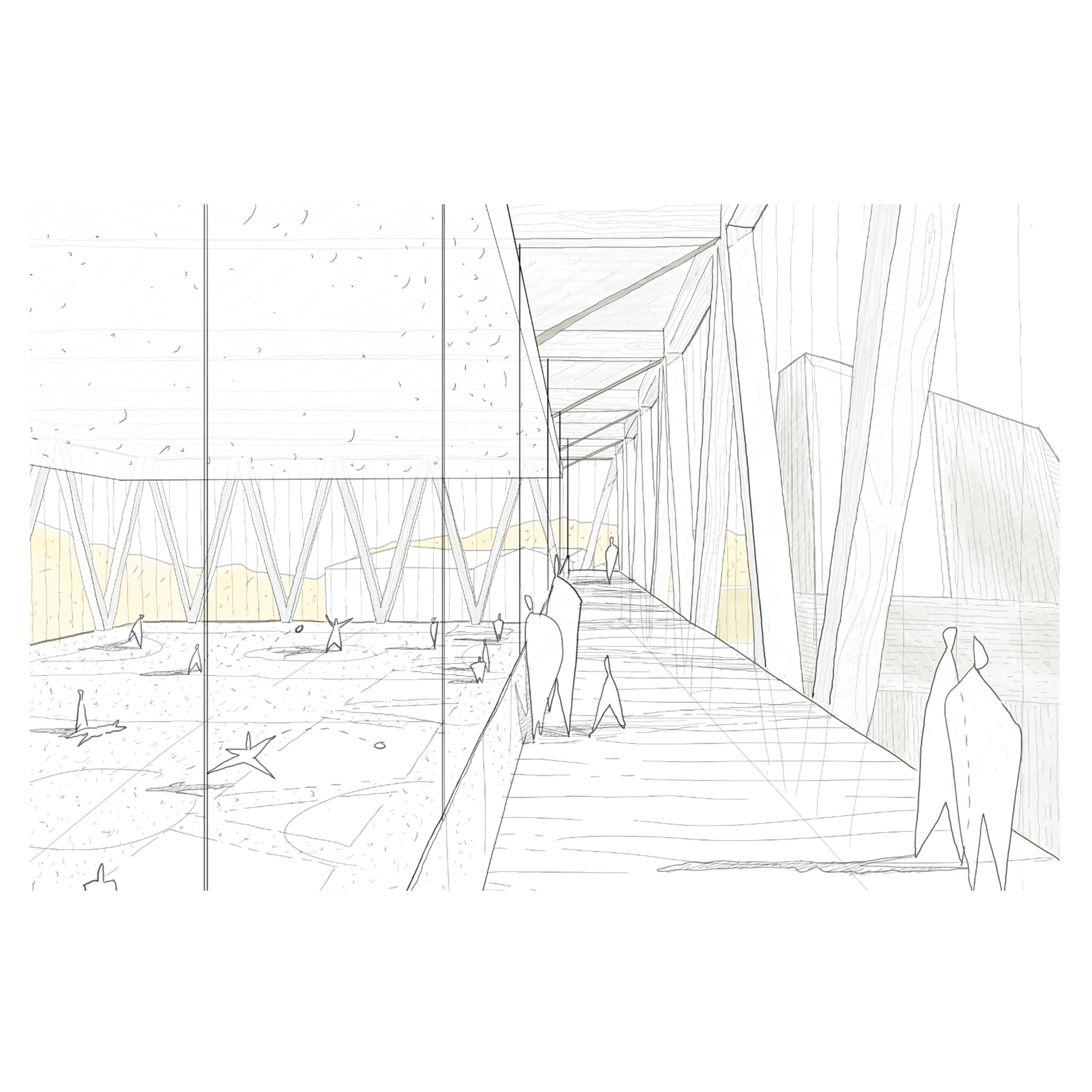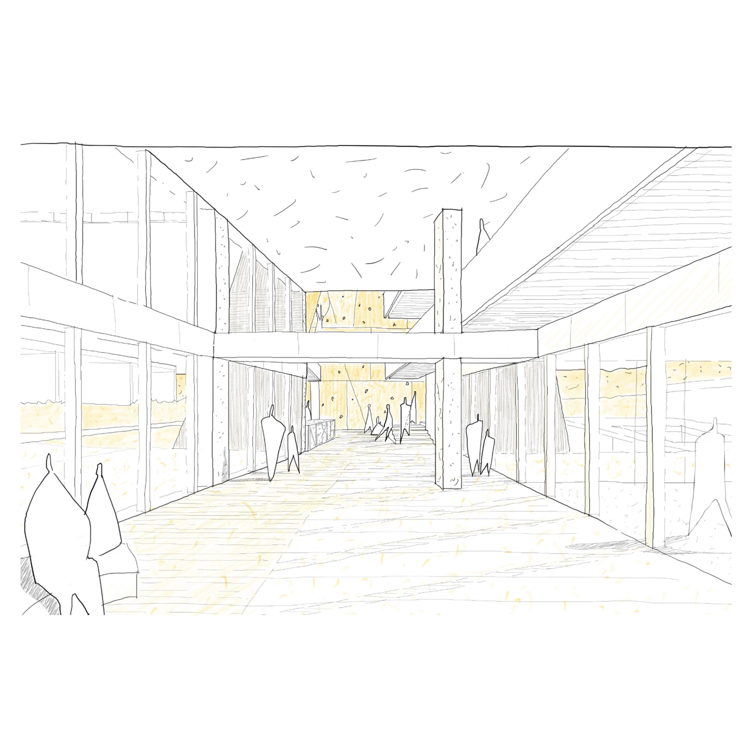 I moduli, seppur ripetibili, trovano una articolazione che differenzia gli spazi attraverso le diverse coperture, l’introduzione di vuoti nella maglia modulare e l’aggiunta di un’area curva realizzata in terra cruda che caratterizza proprio la fase finale del centro.