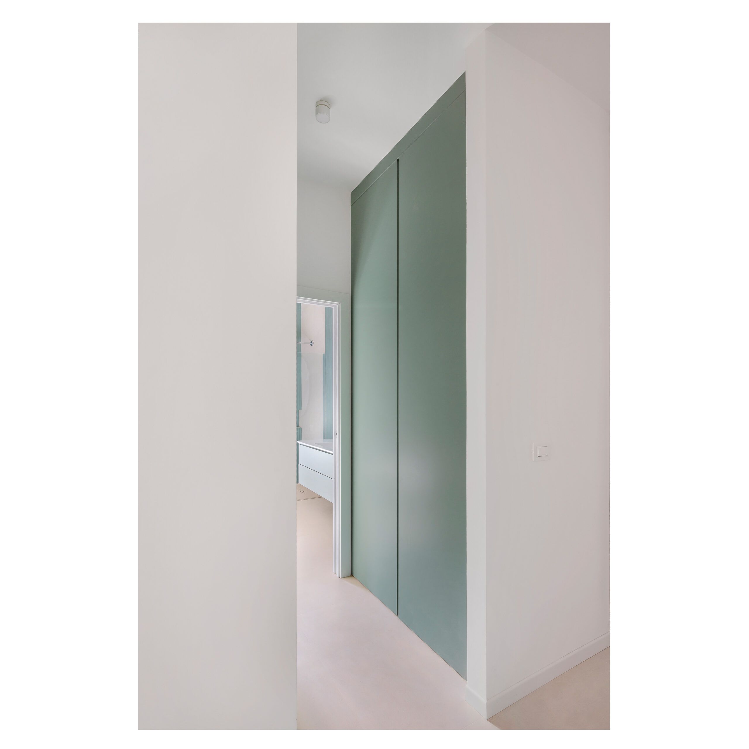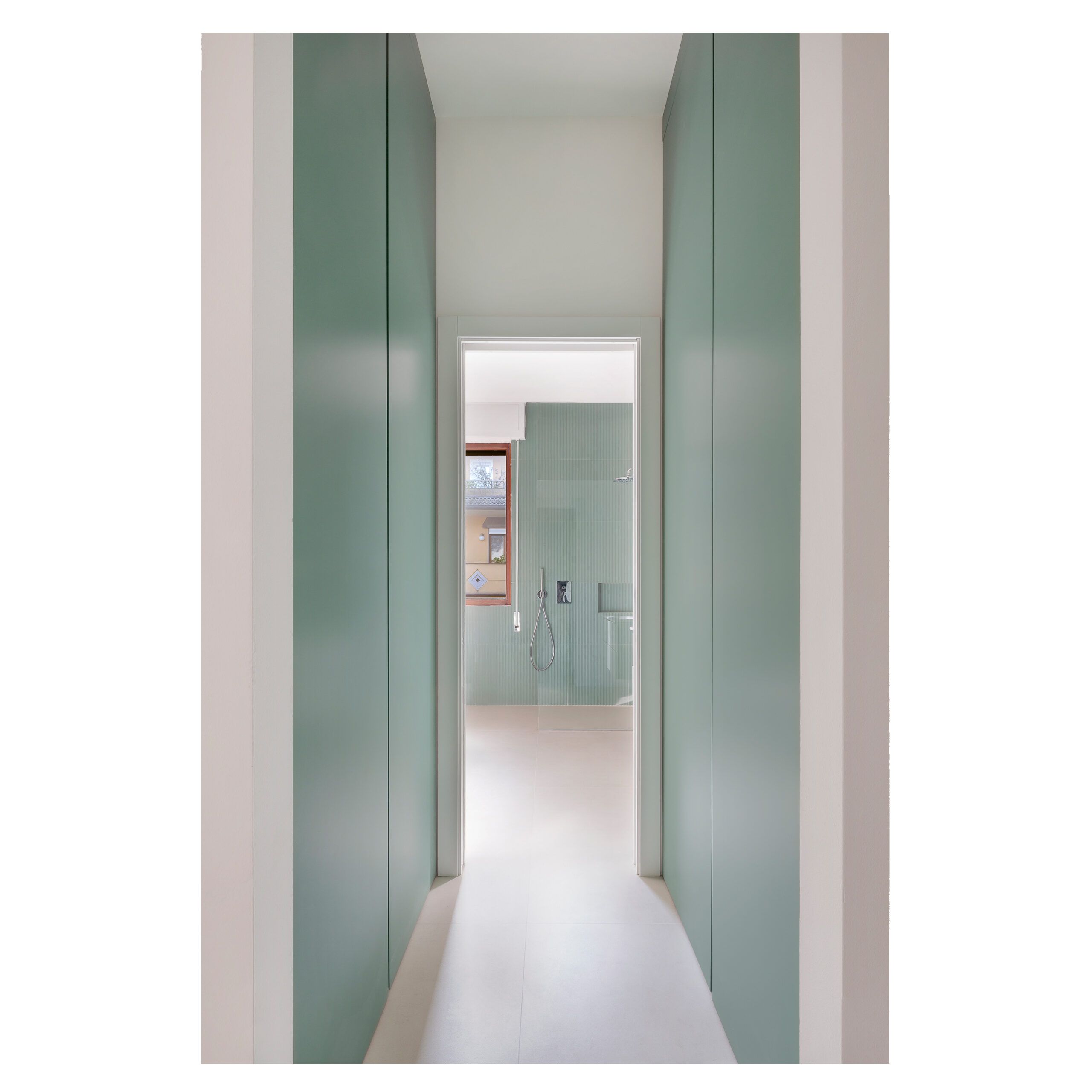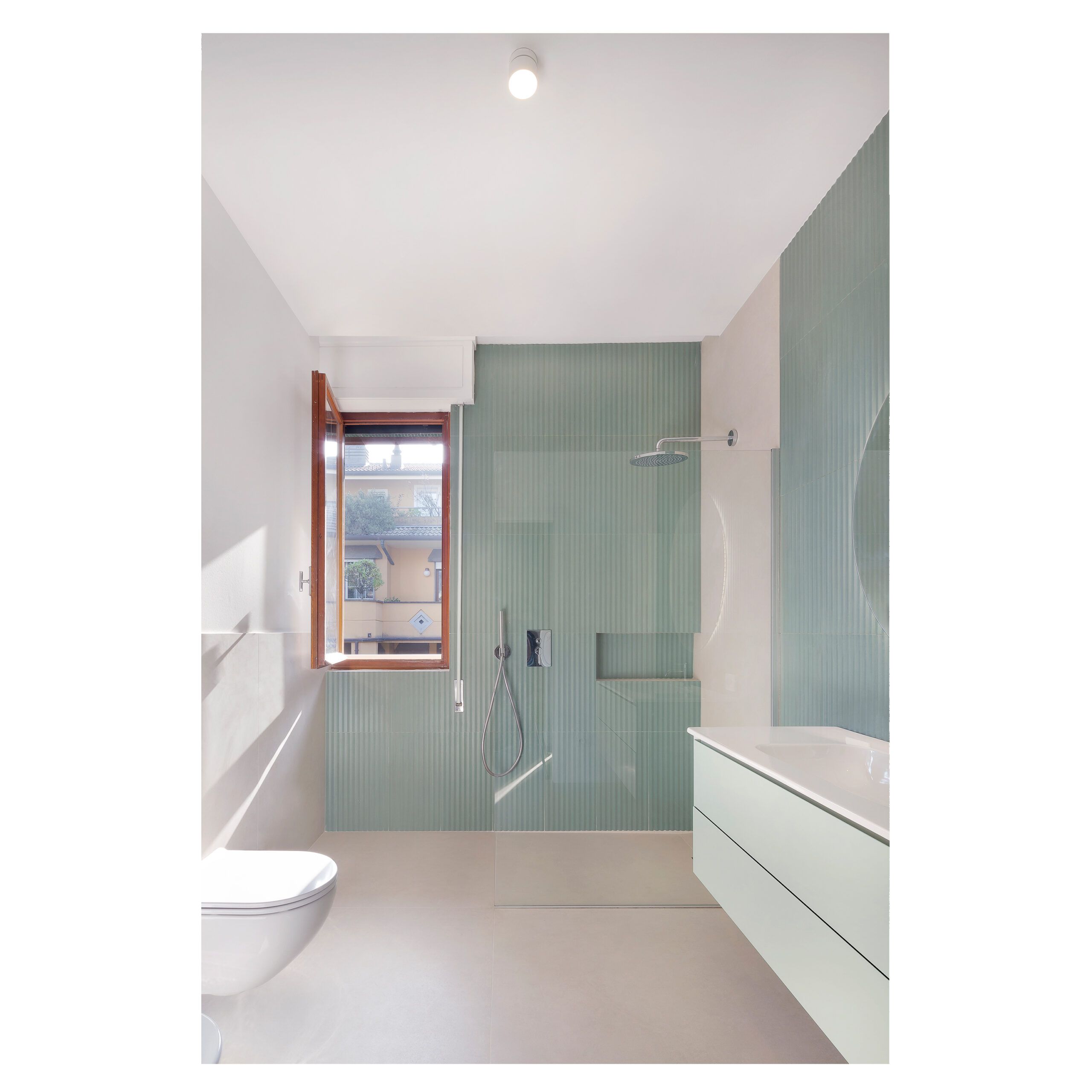La zona lavanderia ed il bagno si caratterizzano come incursione “verde”. In questo caso, infatti, si designa la volontà di esprimere una vera e propria immissione nuova, senza rinunciare a rimandi cromatici con il passato del mosaico verde dei balconi. In una poetica di continui rimandi di fusioni e differenziazioni, ecco che le ante laccate verdi della lavanderia si uniscono con gradevolezza estetica al nuovo mobiletto in bagno ed il peculiare rivestimento in gres verde disegna una superficie continua e plissettata creando un abito elegante che si muove con la luce.