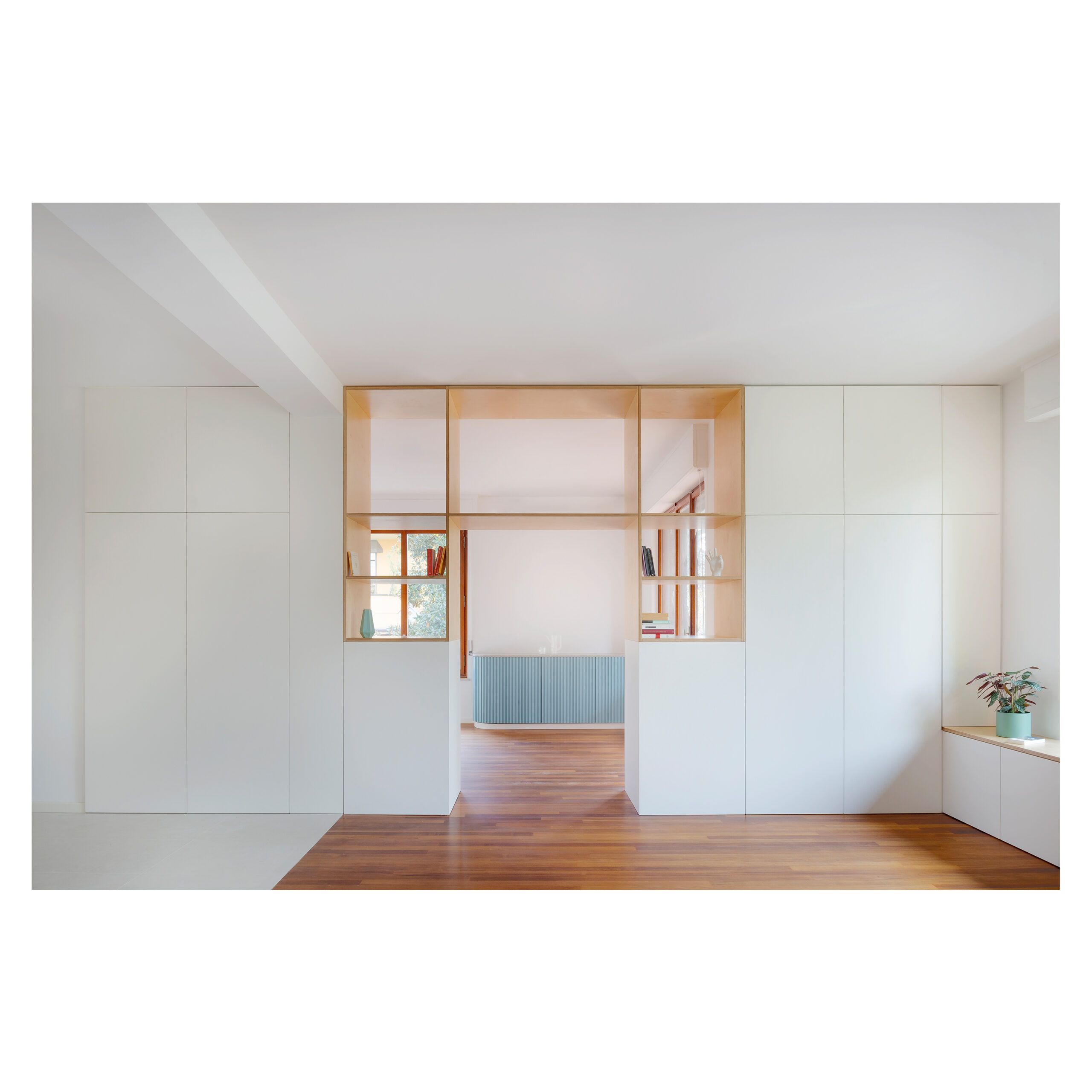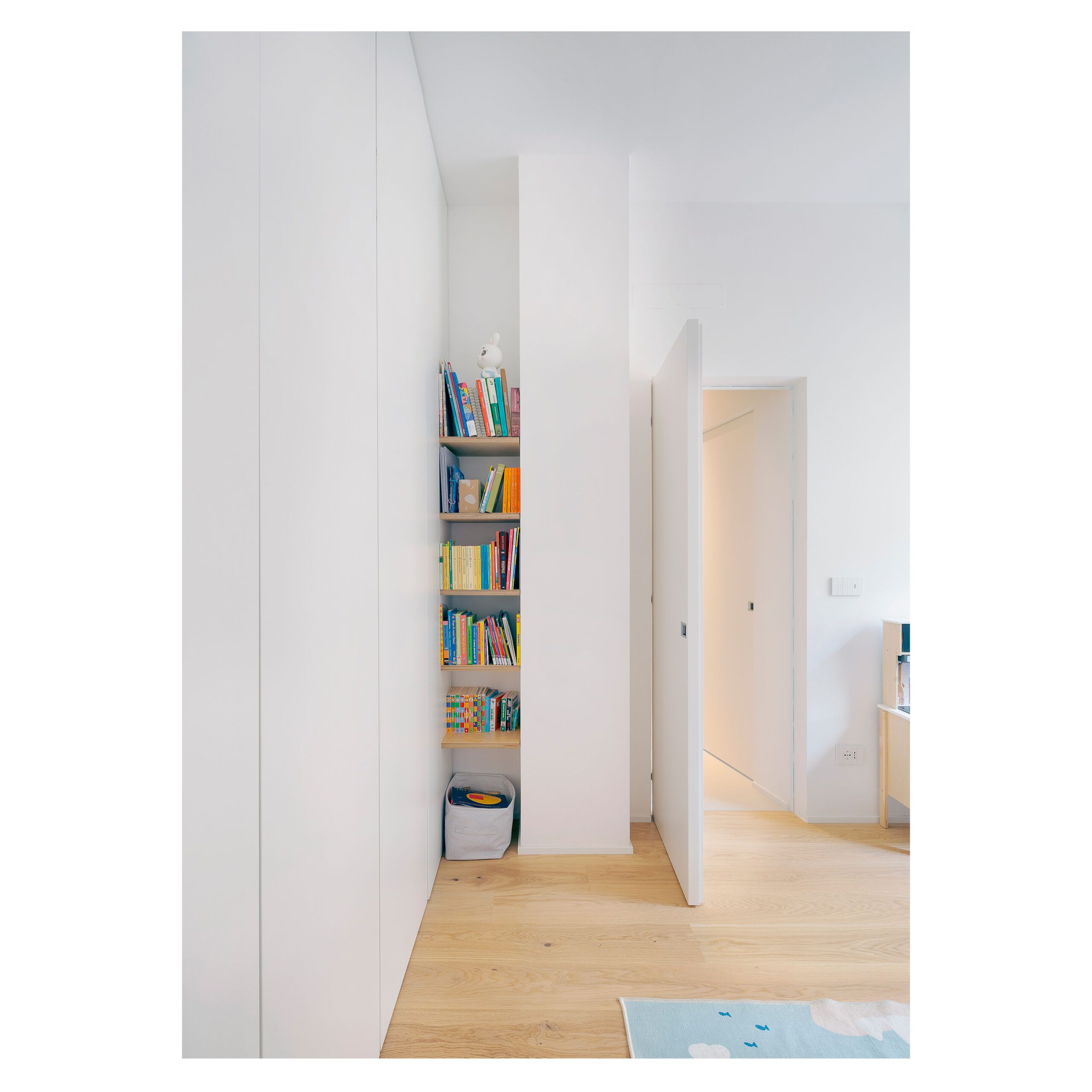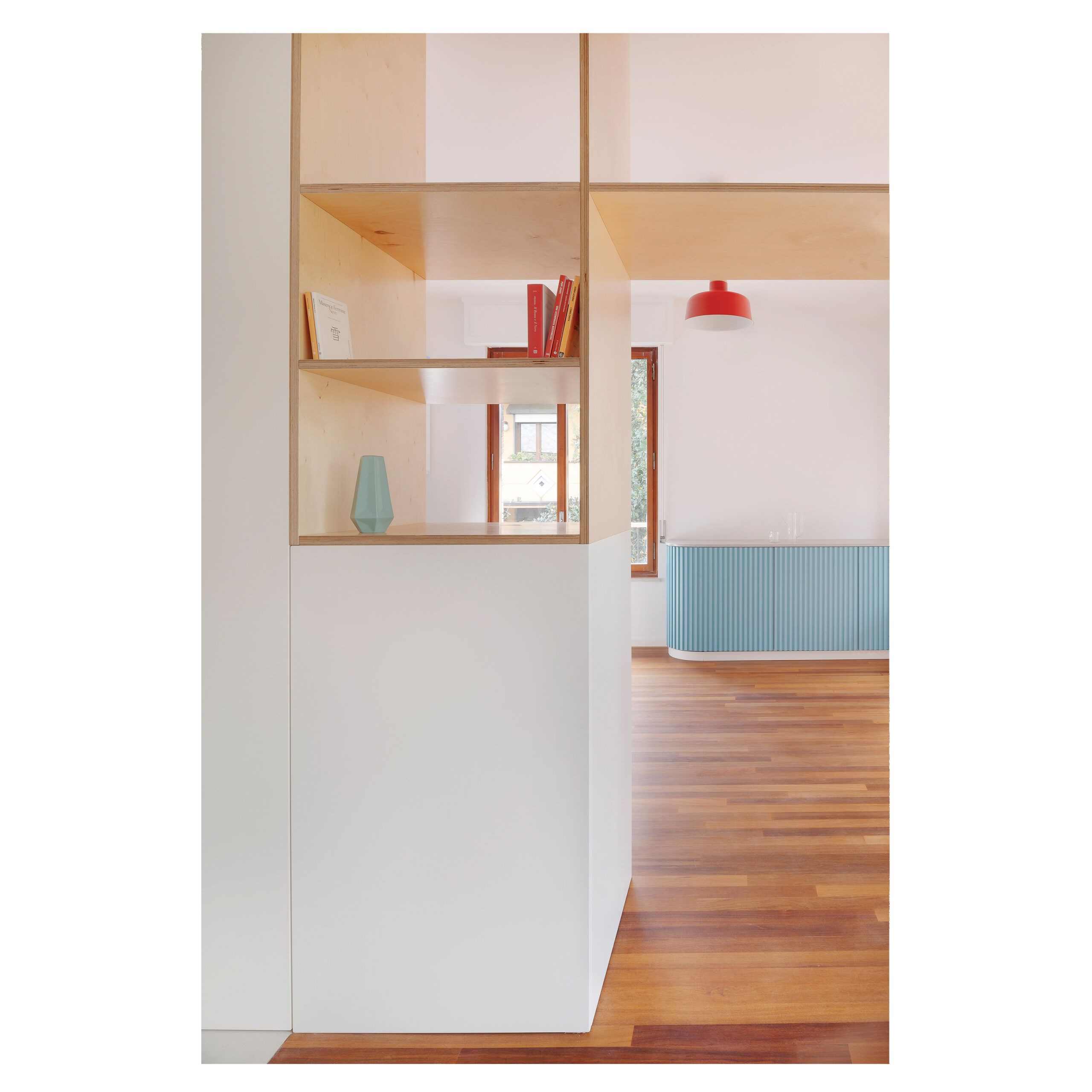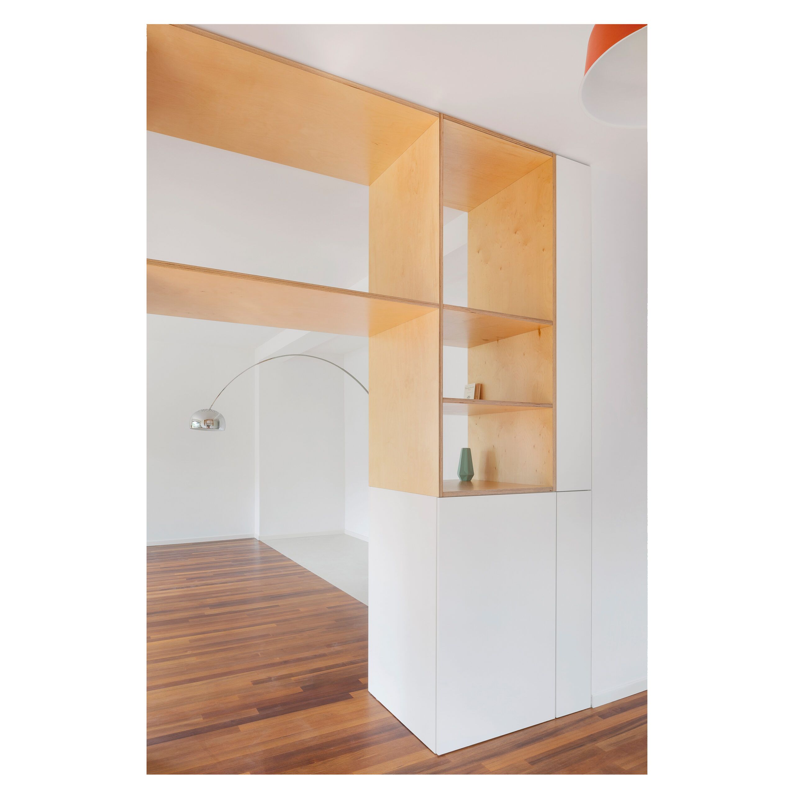 Si pone su questa linea strategico-progettuale, il portale tra soggiorno e cucina che non solo divide senza separare, ma crea anche nuove cornici ed aiuta a definire le visuali sulle aperture esistenti. Senza rinunciare alla risposta funzionale di contenitivo, questo arredo su misura designa nuove prospettive che arricchiscono lo spazio senza eccedere, divenendo silenzioso protagonista. La scelta della laccatura bianca e della betulla, infatti, creano un fondale chiaro che non interferisce con le essenze più scure degli infissi esistenti e del parquet mantenuto.
