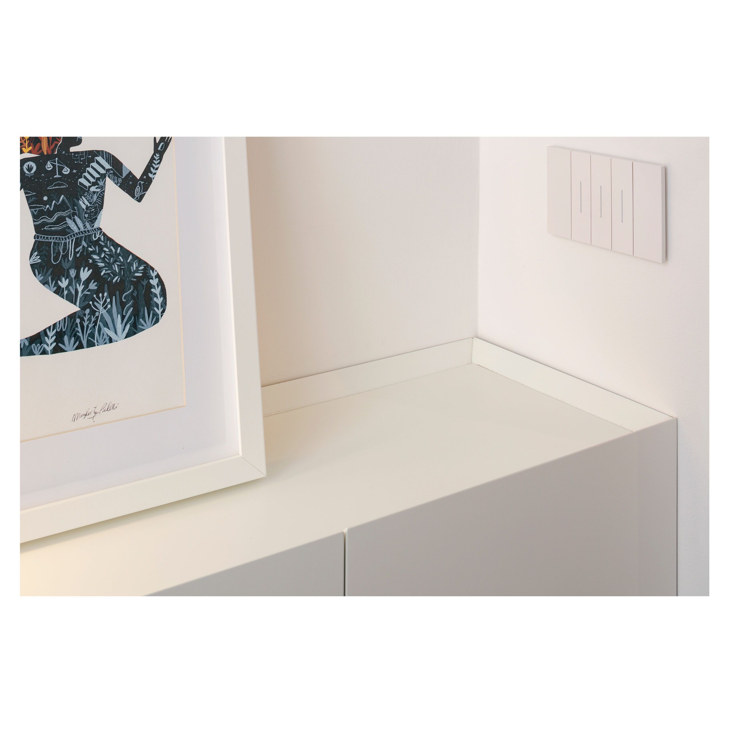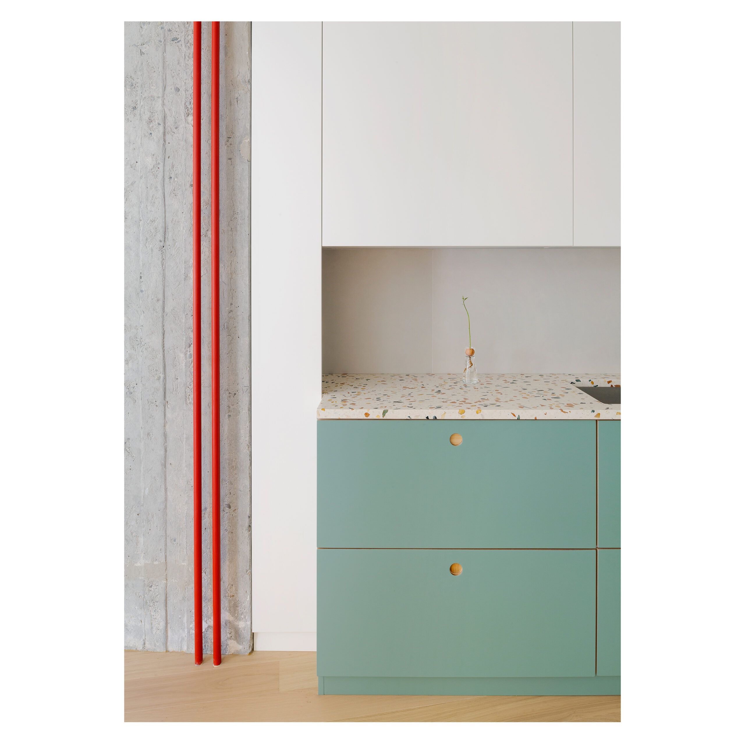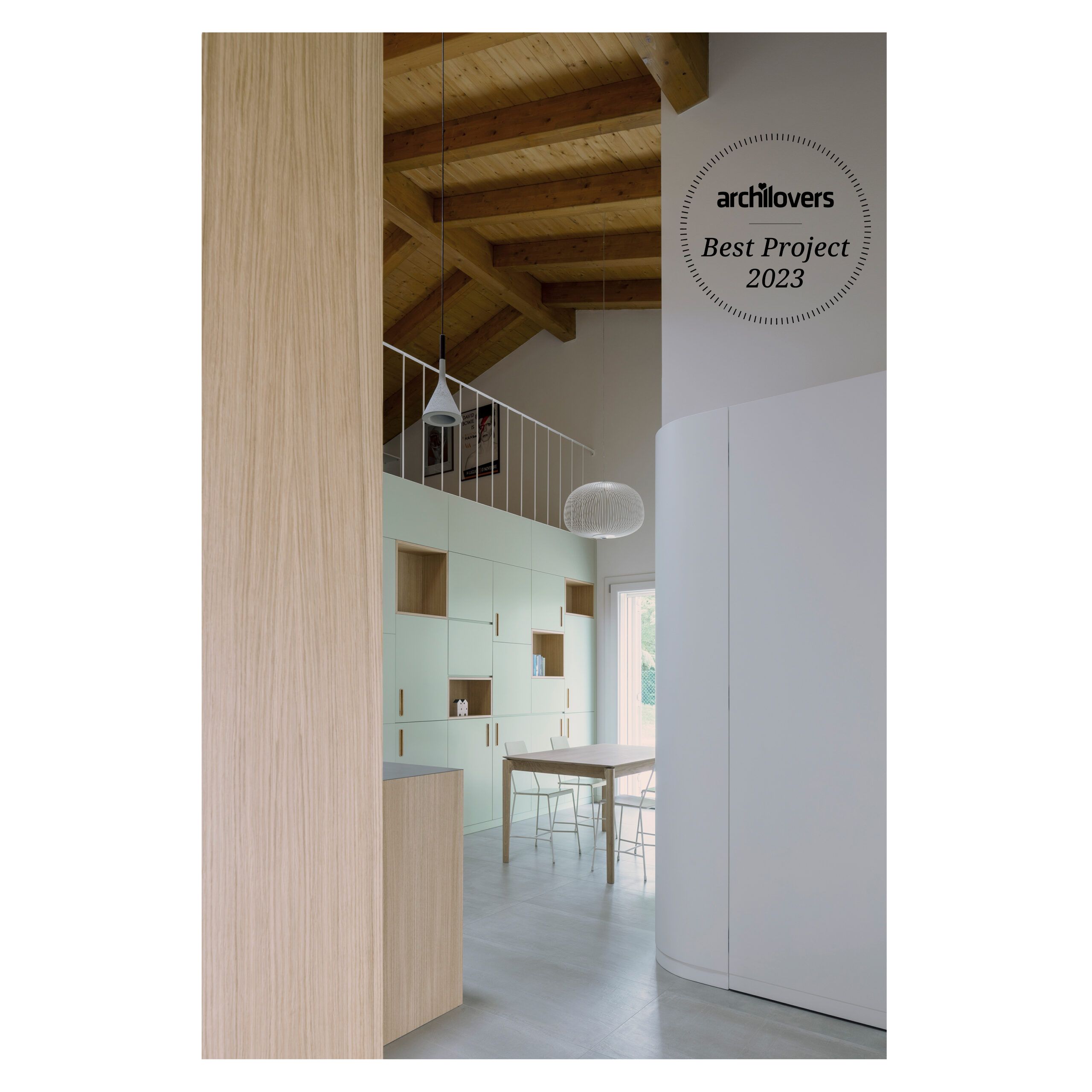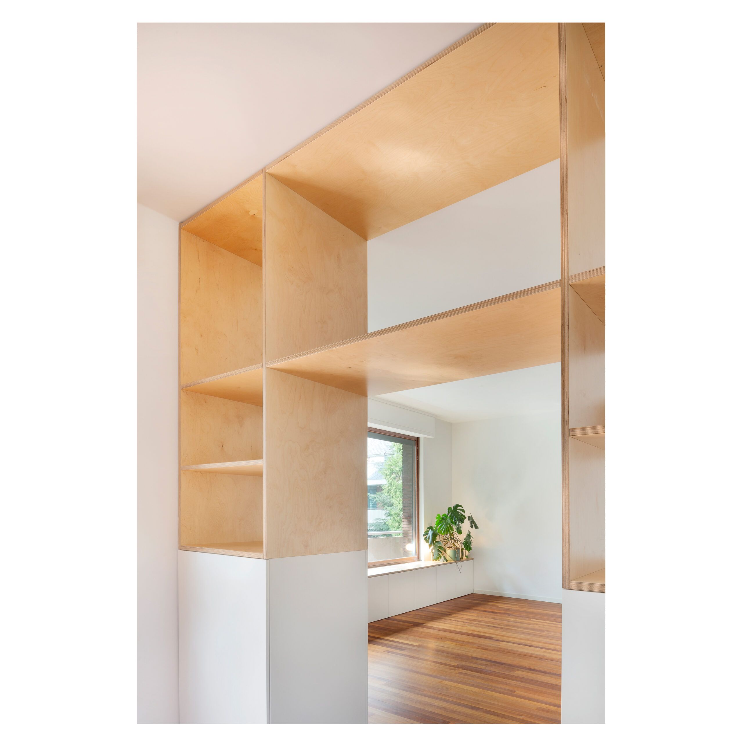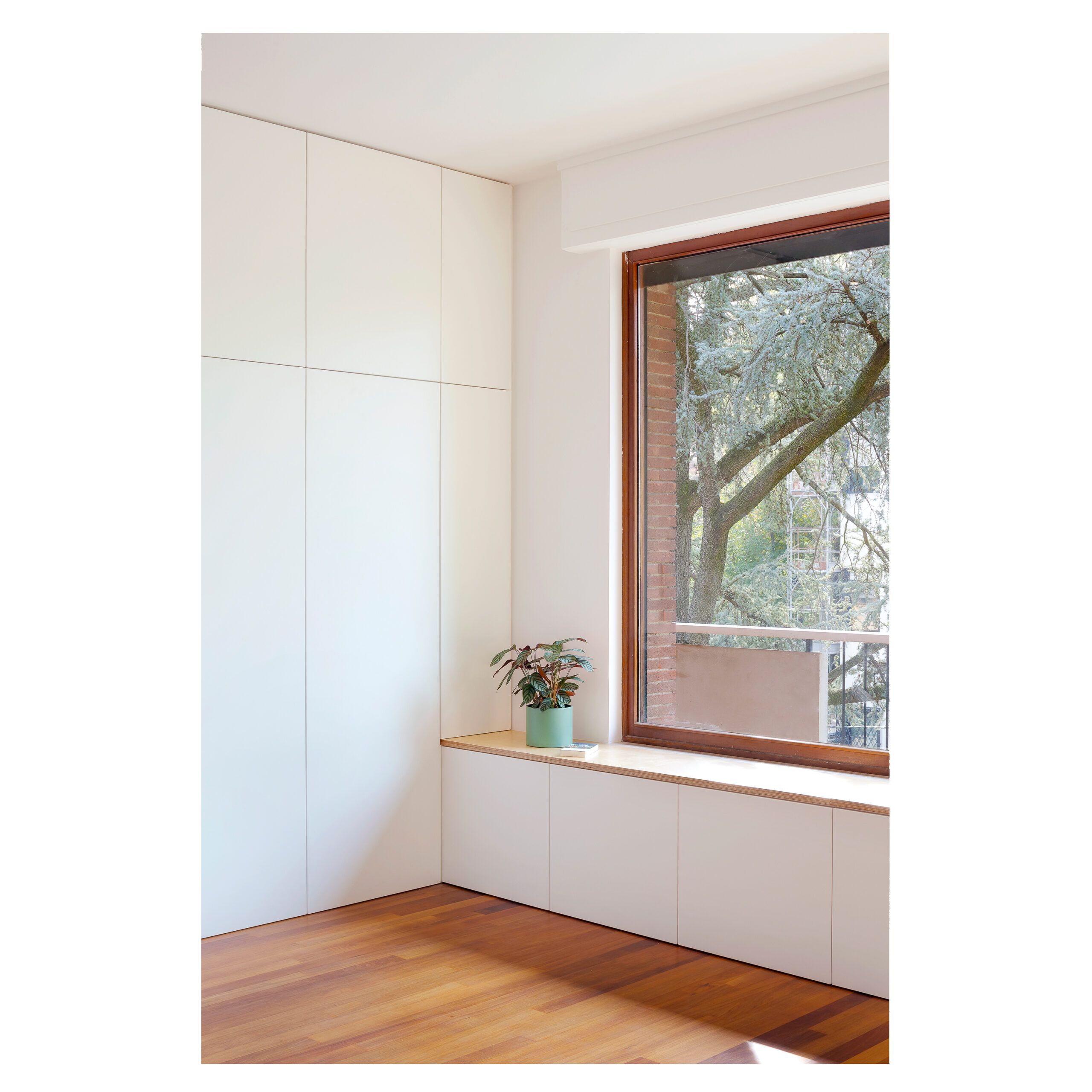 Si pone su questa linea strategico-progettuale, il portale tra soggiorno e cucina che non solo divide senza separare, ma crea anche nuove cornici ed aiuta a definire le visuali sulle aperture esistenti. Senza rinunciare alla risposta funzionale di contenitivo, questo arredo su misura designa nuove prospettive che arricchiscono lo spazio senza eccedere, divenendo silenzioso protagonista. La scelta della laccatura bianca e della betulla, infatti, creano un fondale chiaro che non interferisce con le essenze più scure degli infissi esistenti e del parquet mantenuto.