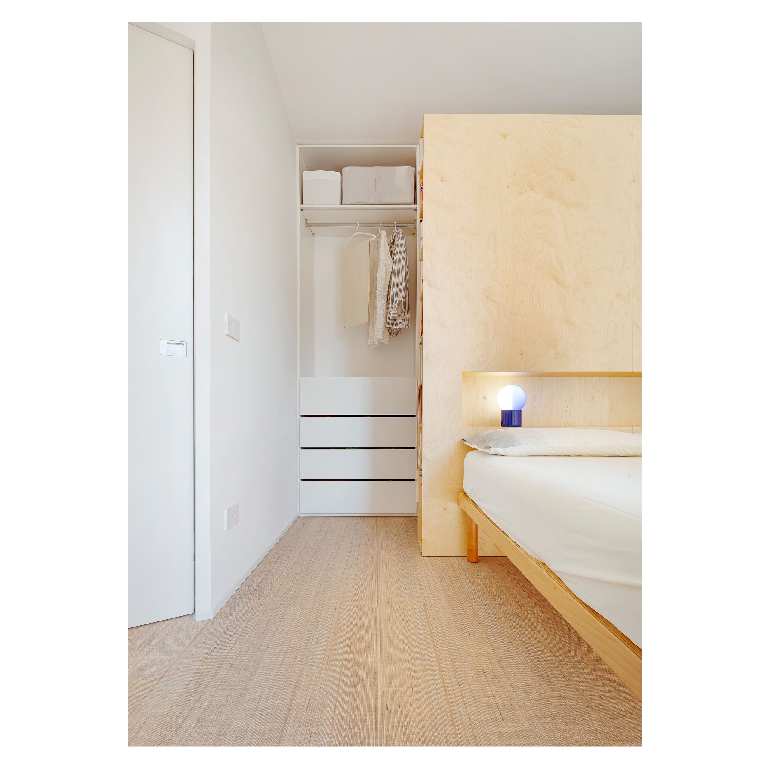 Questa inizia ad intravvedersi nella maniglia circolare incassata ed artigianalmente realizzata della cucina, negli interni dei cassetti, nel multistrato che si mostra di testa nella panca/mobile soggiorno, diviene il top su cui si appoggia il lavabo in bagno fino ad essere la vera protagonista nella camera padronale. Qui a terra il parquet si declina in un tatami (chiamato Fabrique da Listone Giordano) che crea una prospettiva culminante nella quinta schienale letto tutta realizzata in multistrato di betulla. Sia sul piano orizzontale (il fabrique è un insieme di listelli di betulla disposta di testa) sia su quello verticale dello schienale, la betulla si mostra in tutta la sua essenza rilassante e protagonista al tempo stesso.