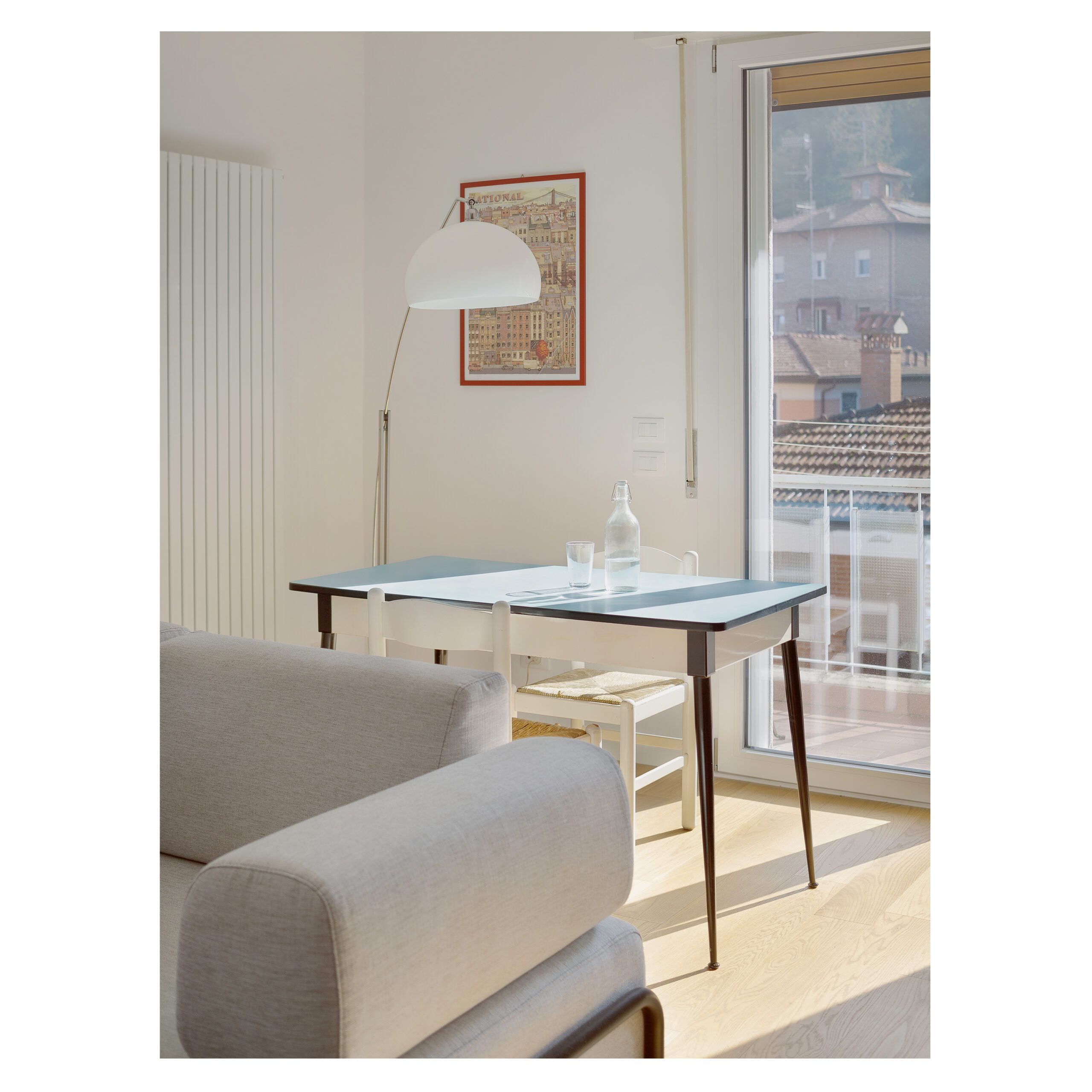un distributivo, non regolare, per la zona notte che divide lo spazio doccia dalla restante parte del bagno e la posizione, subito dopo l’ingresso, della cucina. I pensili della cucina vengono allineati sotto la trave e, dove prima c’era il ripostiglio, abbiamo previsto tre blocchi arredo con la funzione di guardaroba, frigorifero e colonna forno. Nessuno dei compromessi che solitamente vengono attuati con gli altri clienti privati, trova spazio in questa casa, dove ogni scelta diviene architettura con ludica e lucida fermezza. Radicali si, ma mantenendo una forte voglia di gioco, abbiamo iniziato a costellare una tela minimale e chiara con elementi pieni di calore e personalità.