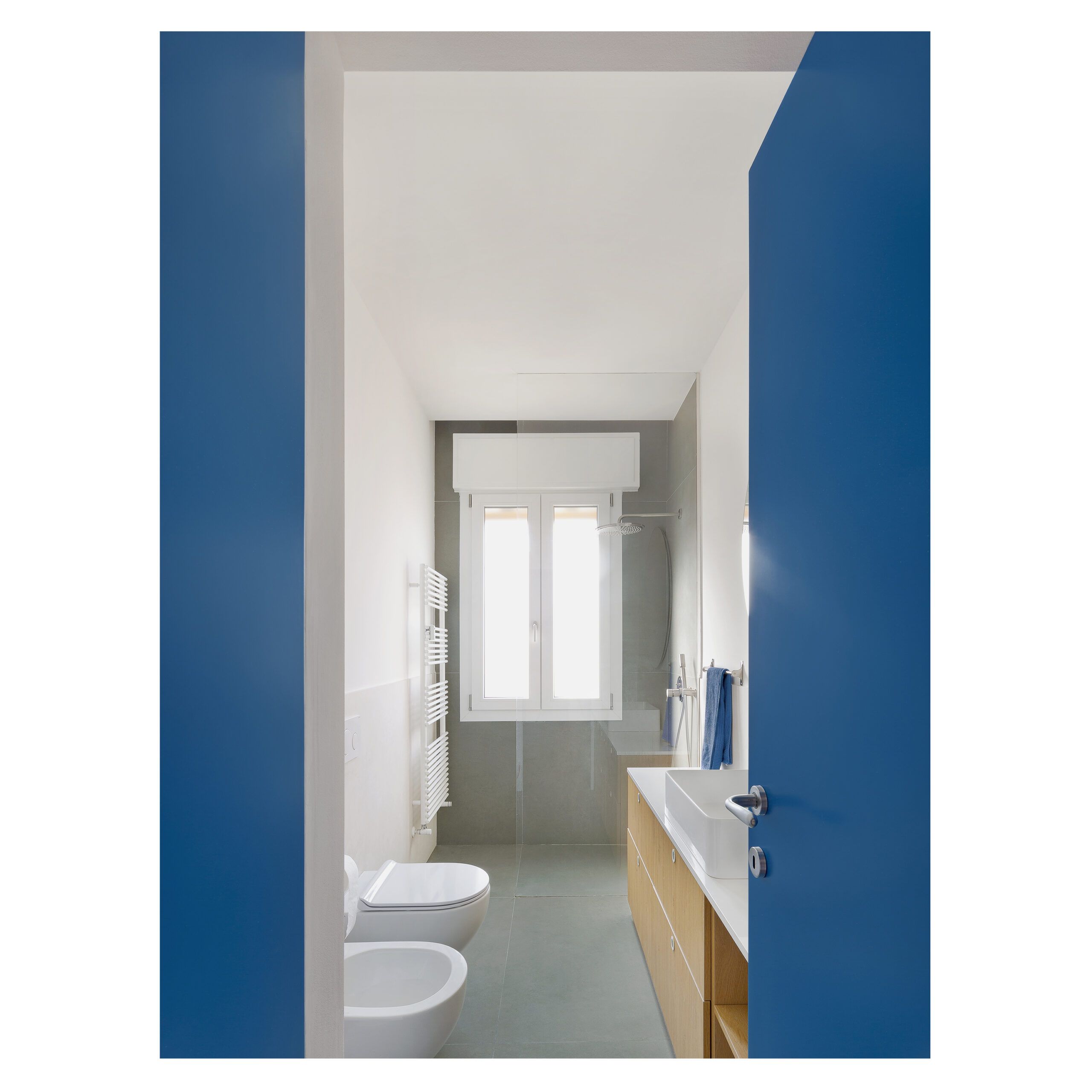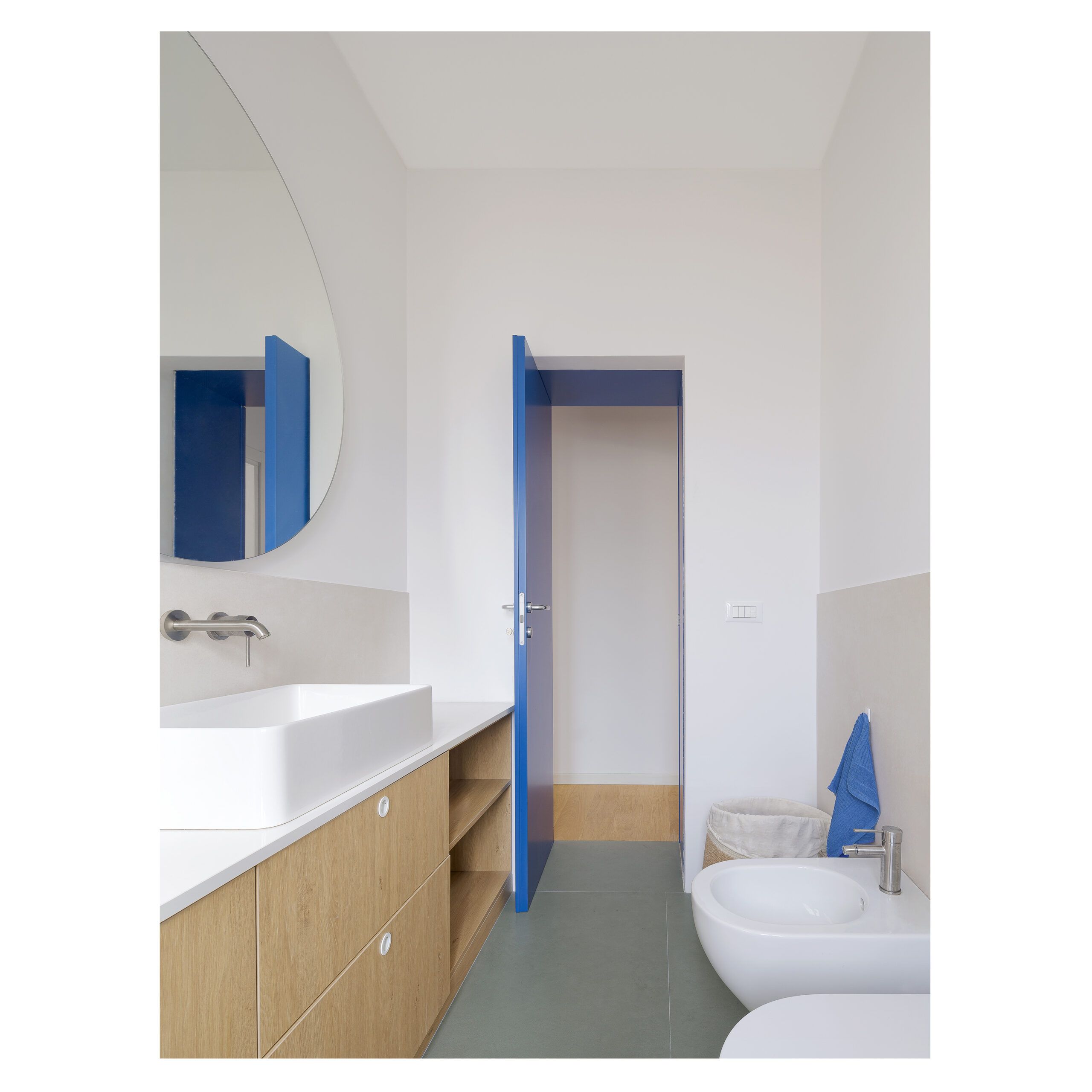 Funzionalità e gioco coesistono insieme a forme e colori. Il bagno, rivisto e riproporzionato, diviene un ambiente mediterraneo in cui la luminosità dei piccoli listelli bianchi esalta ancor più le geometrie bianche e blu della pavimentazione.