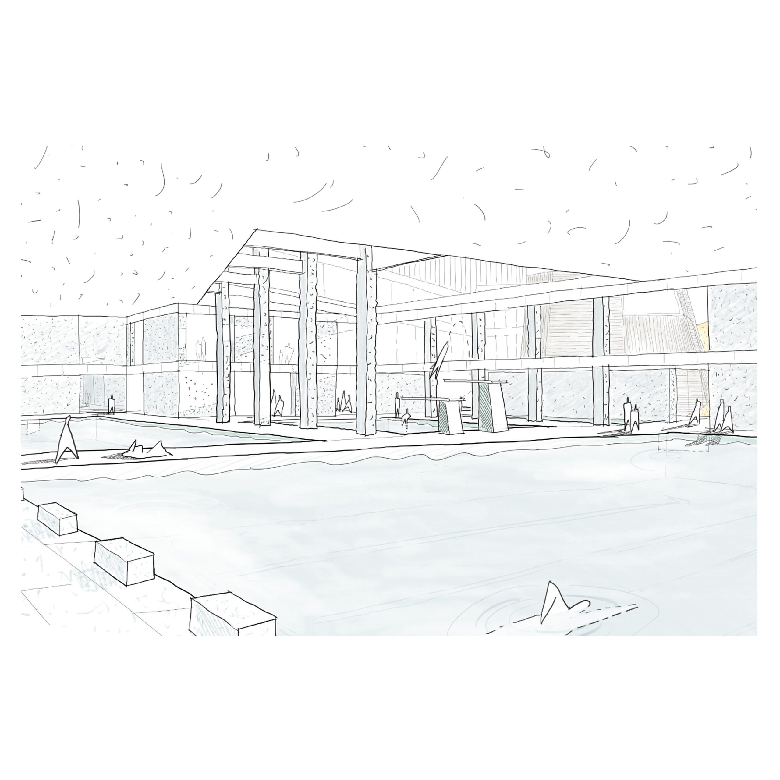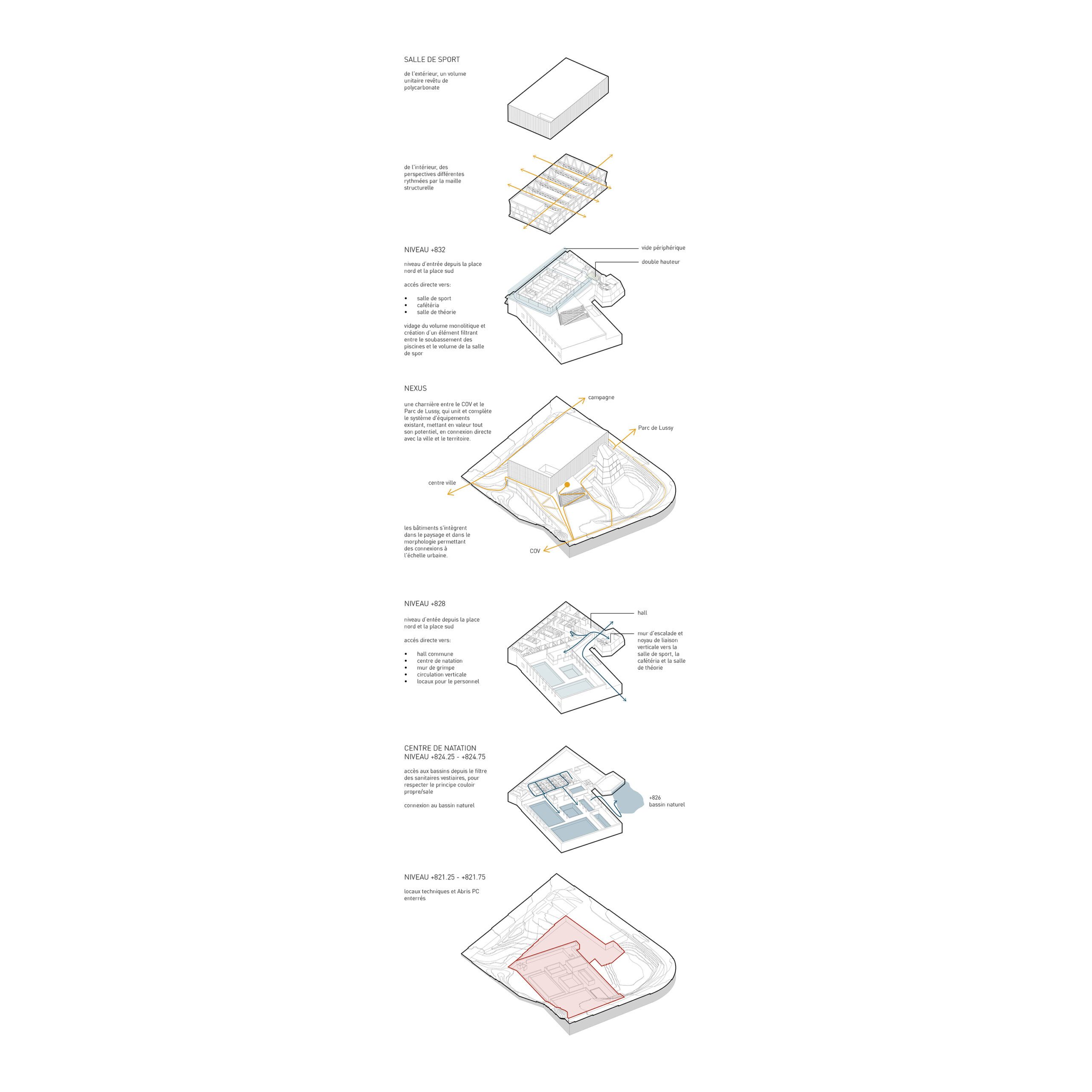 Il volume della palestra è leggermente ruotato rispetto a quello sottostante delle piscine e gli spazi intestiziali divengono occasioni di nuovi percorsi e spazi da vivere anche quando il centro non è in funzione. Si attuano diverse azioni compositive volte a cercare la maggiore integrazione e piacevolezza dei 7700 mq di spazi designati da bando.