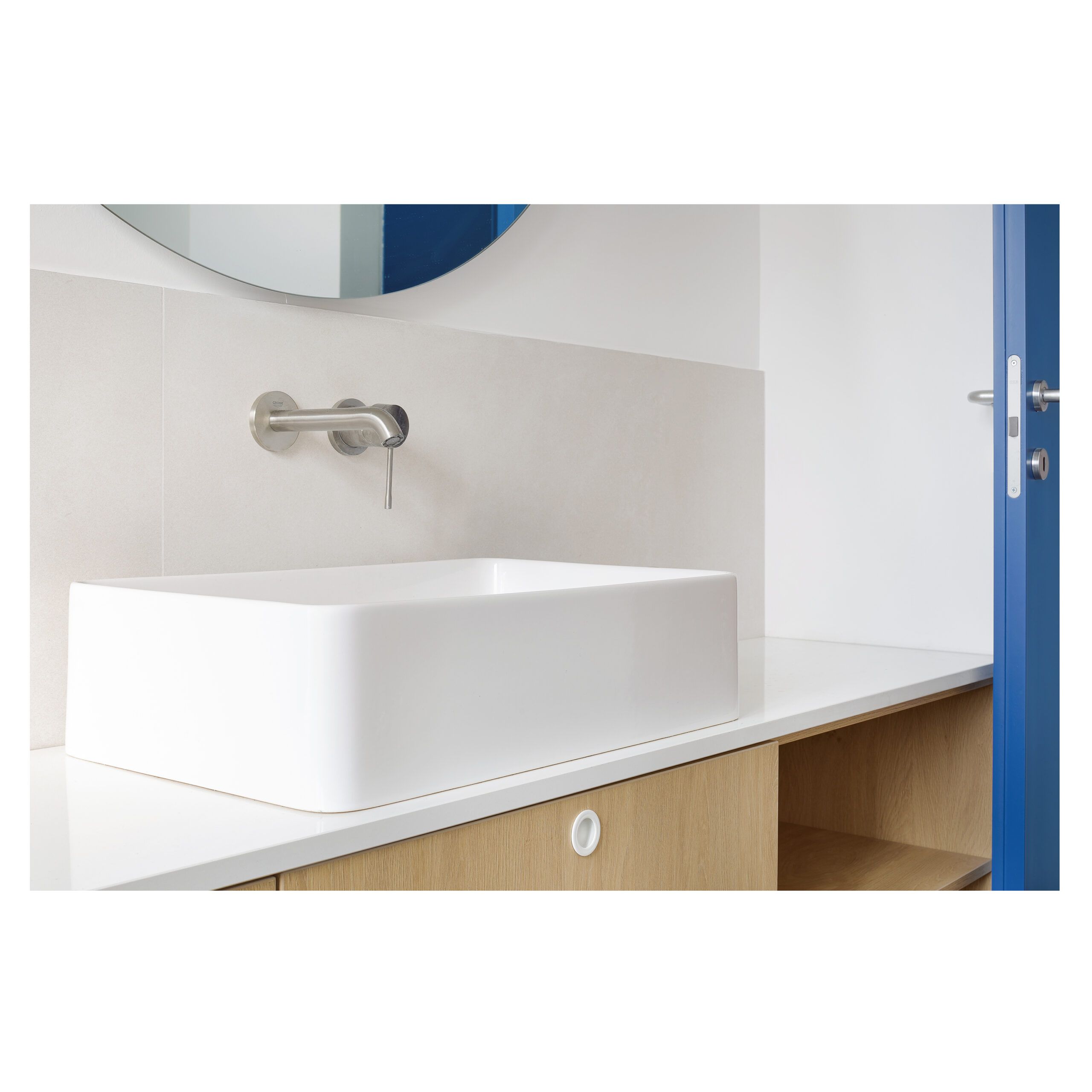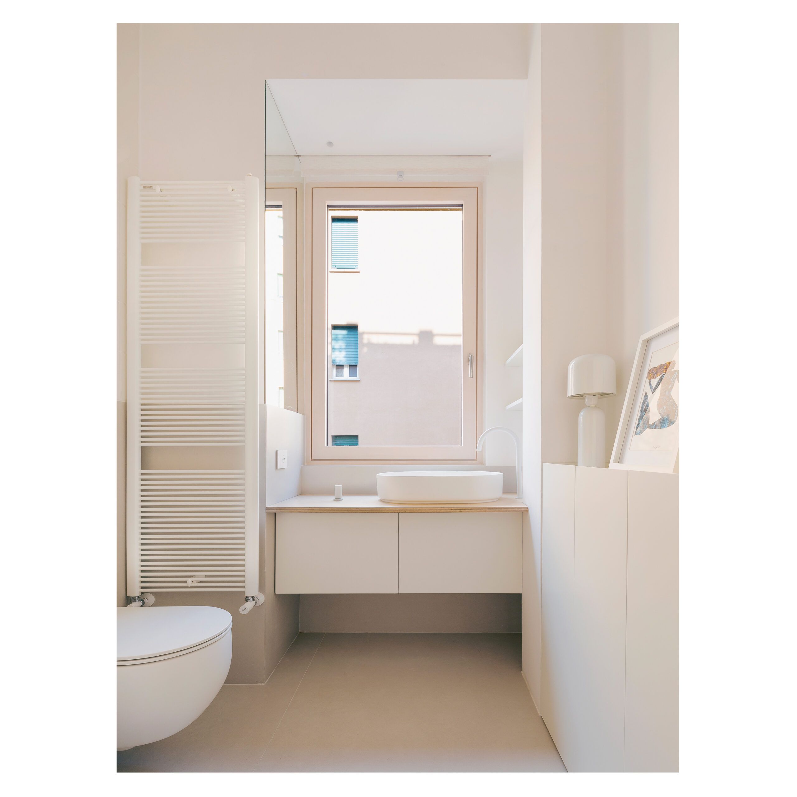 Se quanto descritto fino ad ora colpisce entrando in casa B.V, la vera raffinatezza progettuale e compositiva, si avverte, a nostro avviso, nella zona meno protagonista solitamente e più strettamente relegata a mera funzione e collegamento ossia nella zona corridoio e distribuzione che collega zona giorno e camere. La geometria pensata ha permesso di evitare la porta tra open space e zona notte. Il grès grande formato bianco raccorda elegantemente ed in maniera neutrale i tre diversi parquet. Senza che il visitatore se ne accorga, si fa fondale ma rimane protagonista per far risaltare il bianco totale del bagno dove anche la rubinetteria ed i sanitari bianco-opaco, insieme allo specchio al lato del lavabo, aiutano ad aumentare le ridotte dimensioni e soprattutto introduce il cubo nero della doccia. Anche questa si inserisce per contrasto, così come le illuminazioni LED nell’open space a contatto del cemento della travatura. Anche il corridoio non viene percepito come spazio di distribuzione ma luogo minimale e opaco dove transitare affinché le altre stanze possano brillare. La naturalezza passa anche per l’ardire di dividere doccia da bagno ed aumentare ancor più la non ortogonalità degli spazi. La decisione di inserire nella nostra casa ciò che in questi anni di lavoro abbiamo sperimentato ed che ci crea gioia e benessere, è stata presa perché siamo convinti che sia questo ciò che davvero porti alla funzionalità abitativa.
