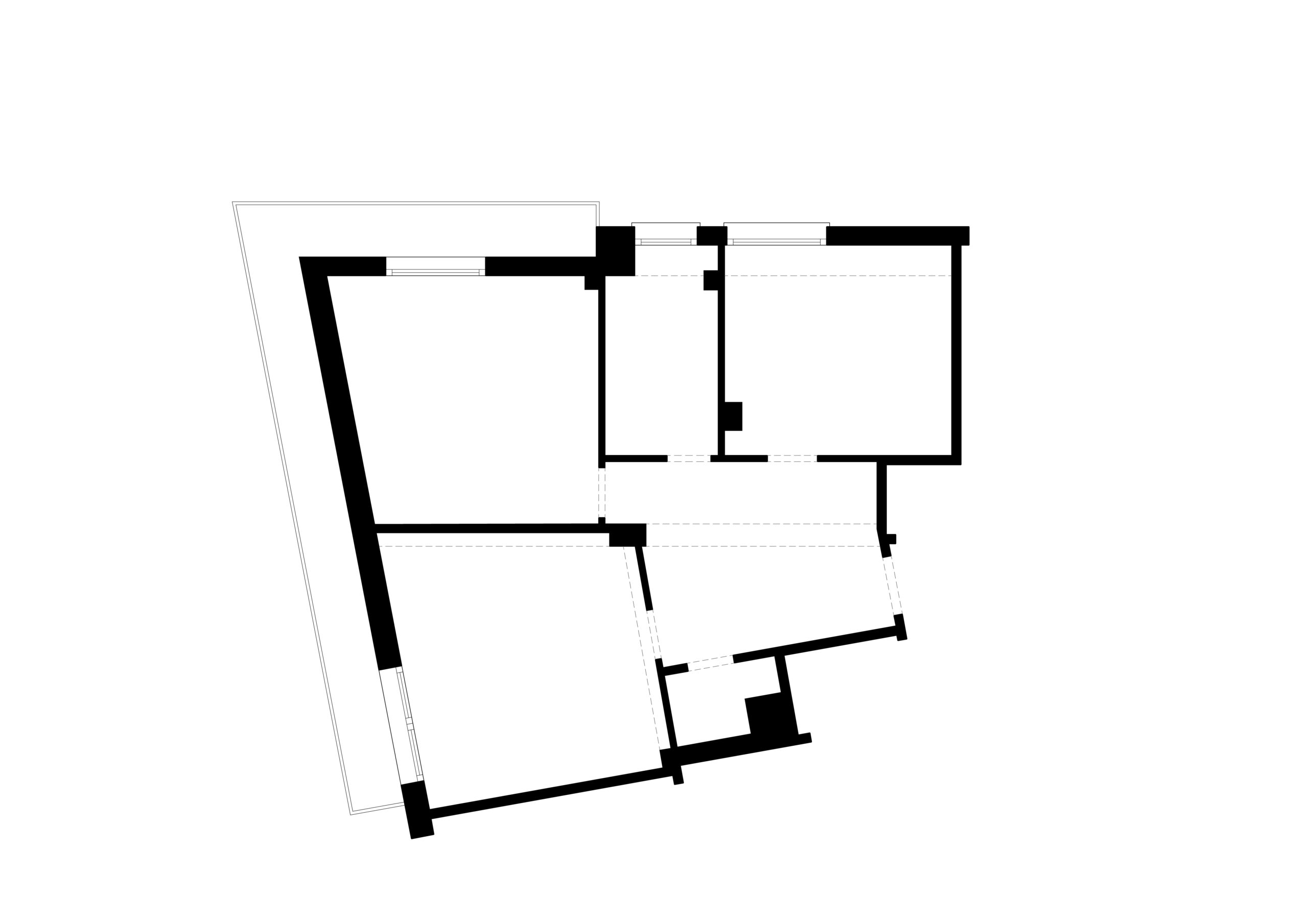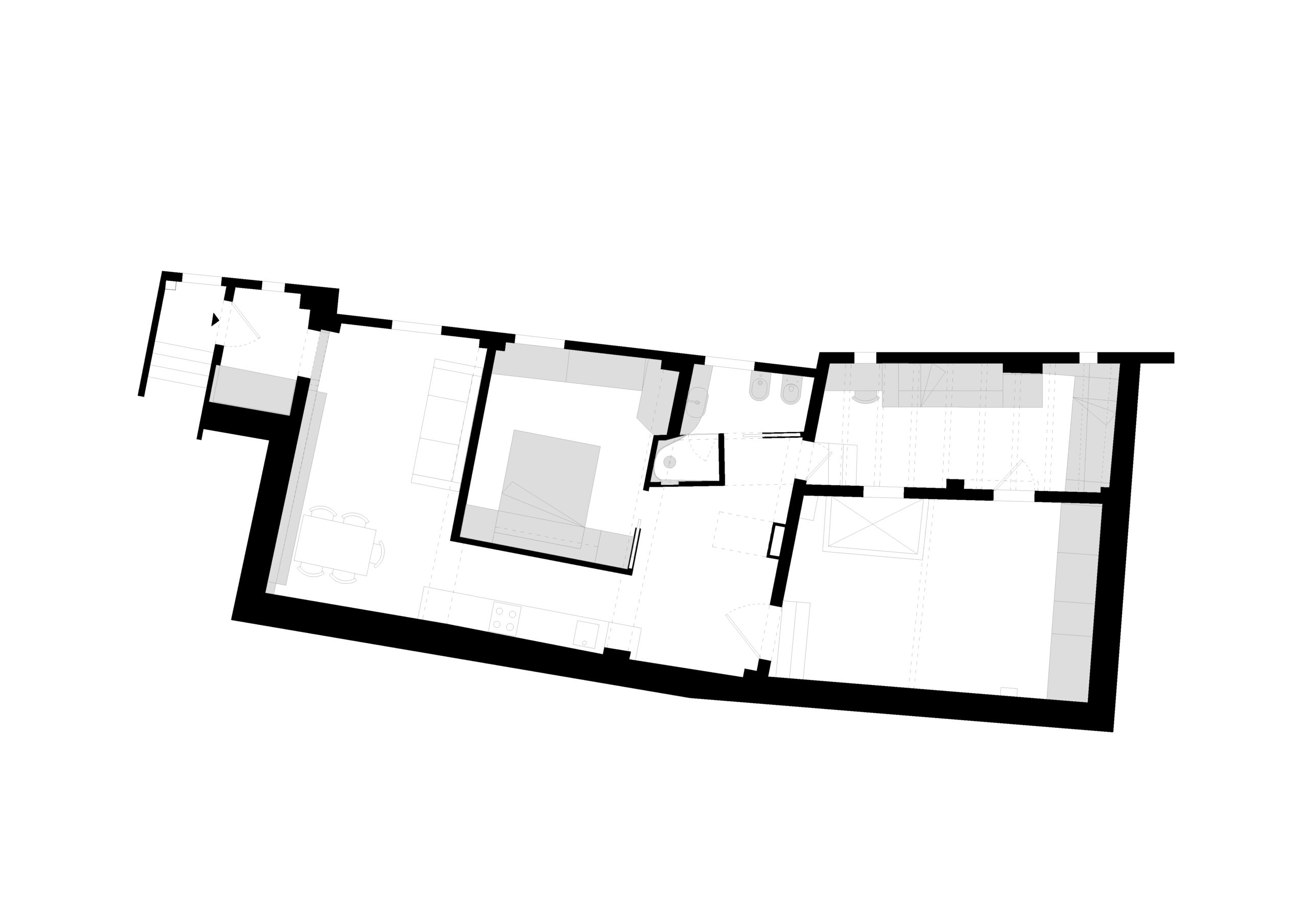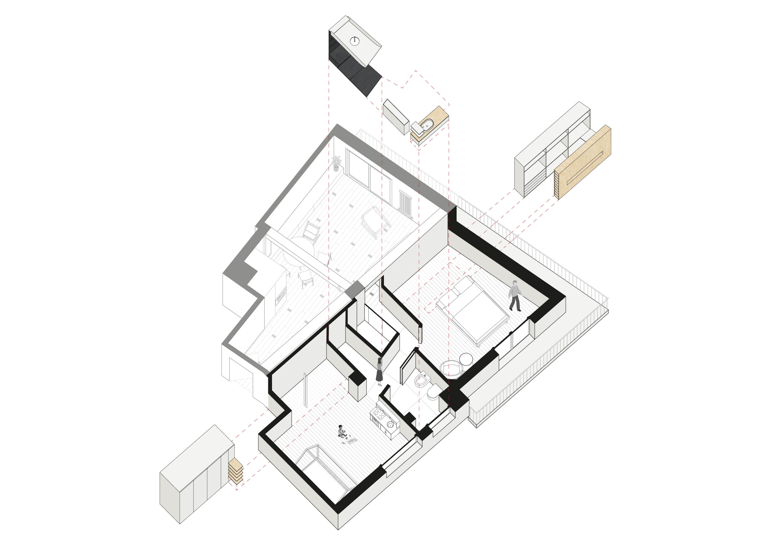 Questa frase di Siza rappresenta la nostra poetica ed in particolare quello che è avvenuto con il progetto CASA B . V. In questo caso il processo ha incluso anche la scelta dell’immobile (acquistato affinché divenisse la nostra casa). La pianta a forma trapezoidale che permetteva prospettive inusuali, il terrazzo ad L, la metratura contenuta ma con ampia possibilità di riformulare il layout ci hanno trasmesso fin da subito la sensazione che fosse la nostra casa, o meglio la nostra sfida.