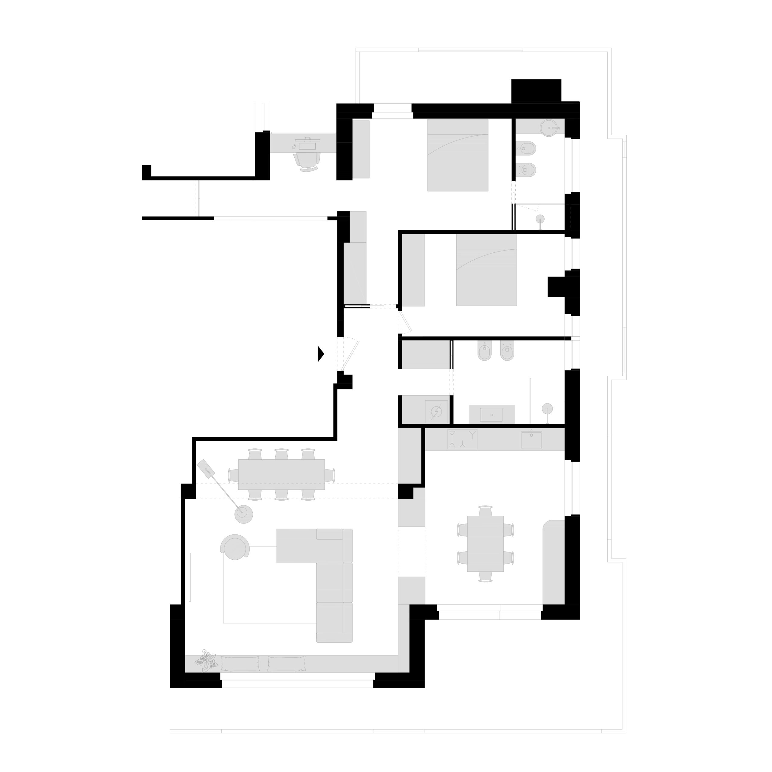 Le generose aperture e la modularità dei prospetti erano pensati per le proporzioni di spazi differenti da quelli risultanti dal frazionamento e la sfida di questo progetto è stata quella di armonizzare elementi di un passato dalle ampie proporzioni con le nuove spazialità.
