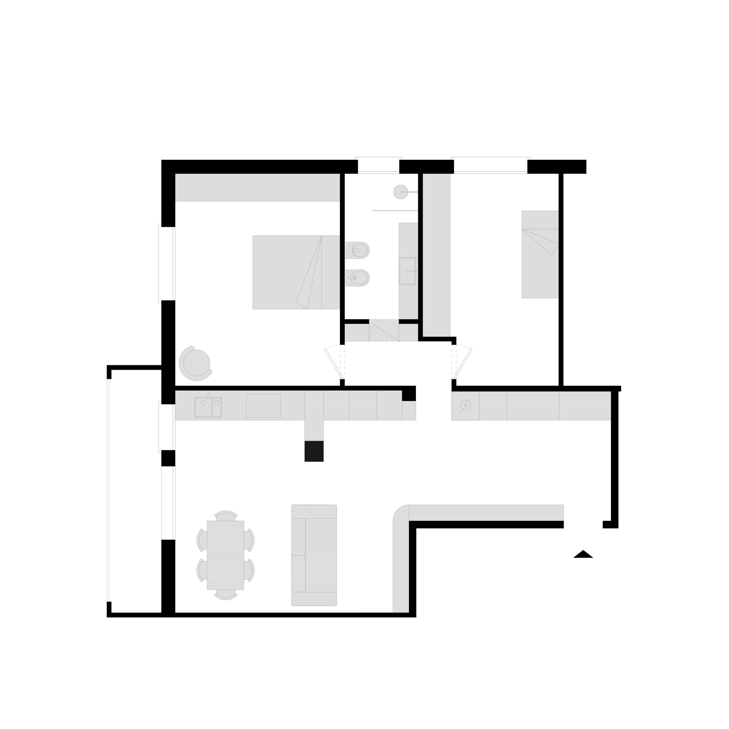 Gli spazi dell’appartamento erano lontani dall’essere adeguatamente sfruttati, quindi sono stati individuati due elementi da eliminare: il grande corridoio d’entrata e lo stretto tinello. Quest’ultimo era talmente angusto da non permetterne l’utilizzo. In corridoio, appena entrati, sulla sinistra, prima di giungere in soggiorno, si aveva una vecchia stufa: la sola fonte di calore dell’appartamento. La partizione che divideva il soggiorno dal tinello é stata eliminata e si é operata una cerchiatura strutturale sul muro portante che divideva l’ingresso dal soggiorno. Per avere un arredo che permettesse di creare una hall/guardaroba senza chiudere il nuovo openspace, si é proceduto inserendo un’armadiatura collocata al centro del portale stesso. La cerchiatura non é stata espressa ma si é andati a creare due archi in cartongesso con una piccola spalletta centrale, dove l‘armadiatura ha trovato ubicazione divenendo giano bifronte: da una parte scarpiera/guardaroba, dall’altra cornice per la nuova cucina.