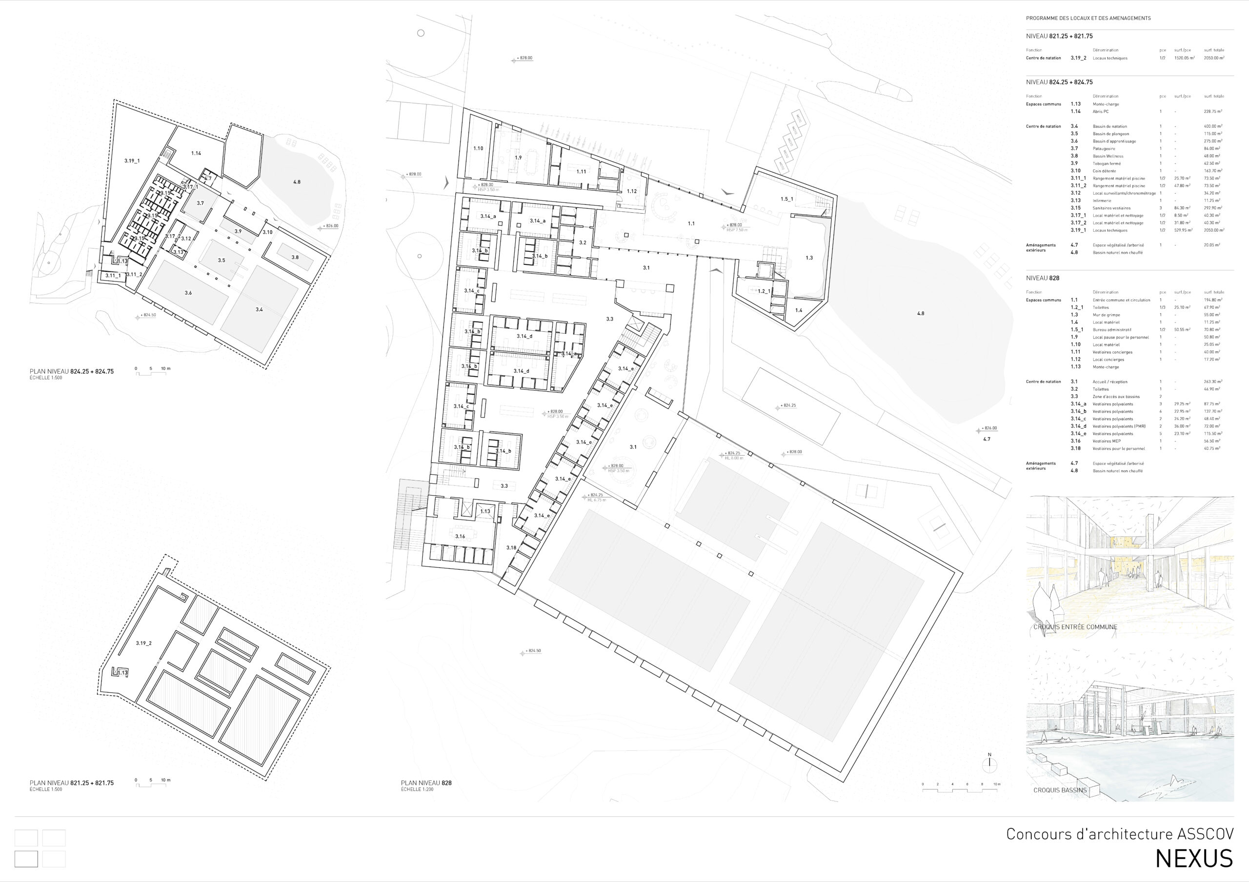 Le immagini 3d, sia realistiche, sia schizzate mostrano con forte immediatezza, come queste caratteristiche, sia negli esterni sia negli interni, creino prospettive interessanti tra uno spazio e l’altro che trovano sia una corretta indipendenza funzionale senza rinuciare alla possibilità di fare una attività sportiva avendo la visuale di un’altra: dallo spazio pubblico esterno si puòtraguardare la piscina ipogea, dal ballatoio/spalti della palestra, le sottostanti aree ginniche, il volume arrampicata e l’esterno, la zona hall ha una vista privilegiata sulla parte di arrampicata che la ingloba anche. Le prospettive divengono, così, sempre momenti privilegiati, interessanti e mai scontati per designare il collegamento che nexus a partire dalla ciità riproietta negli spazi interni.
